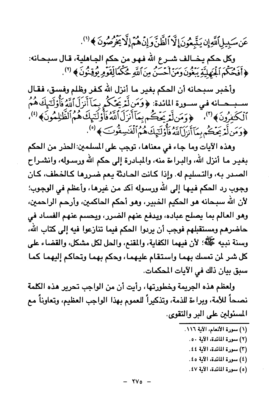 وأخبر سبحانه أن الحكم بغير ما أنزل الله كفر وظلم وفسق، فقال سبحانه في سورة المائدة: {وَمَنْ لَمْ يَحْكُمْ بِمَا أَنْزَلَ اللَّهُ فَأُولَئِكَ هُمُ الْكَافِرُونَ} (¬2) {وَمَنْ لَمْ يَحْكُمْ بِمَا أَنْزَلَ اللَّهُ فَأُولَئِكَ هُمُ الظَّالِمُونَ} (¬3) {وَمَنْ لَمْ يَحْكُمْ بِمَا أَنْزَلَ اللَّهُ فَأُولَئِكَ هُمُ الْفَاسِقُونَ} (¬4)