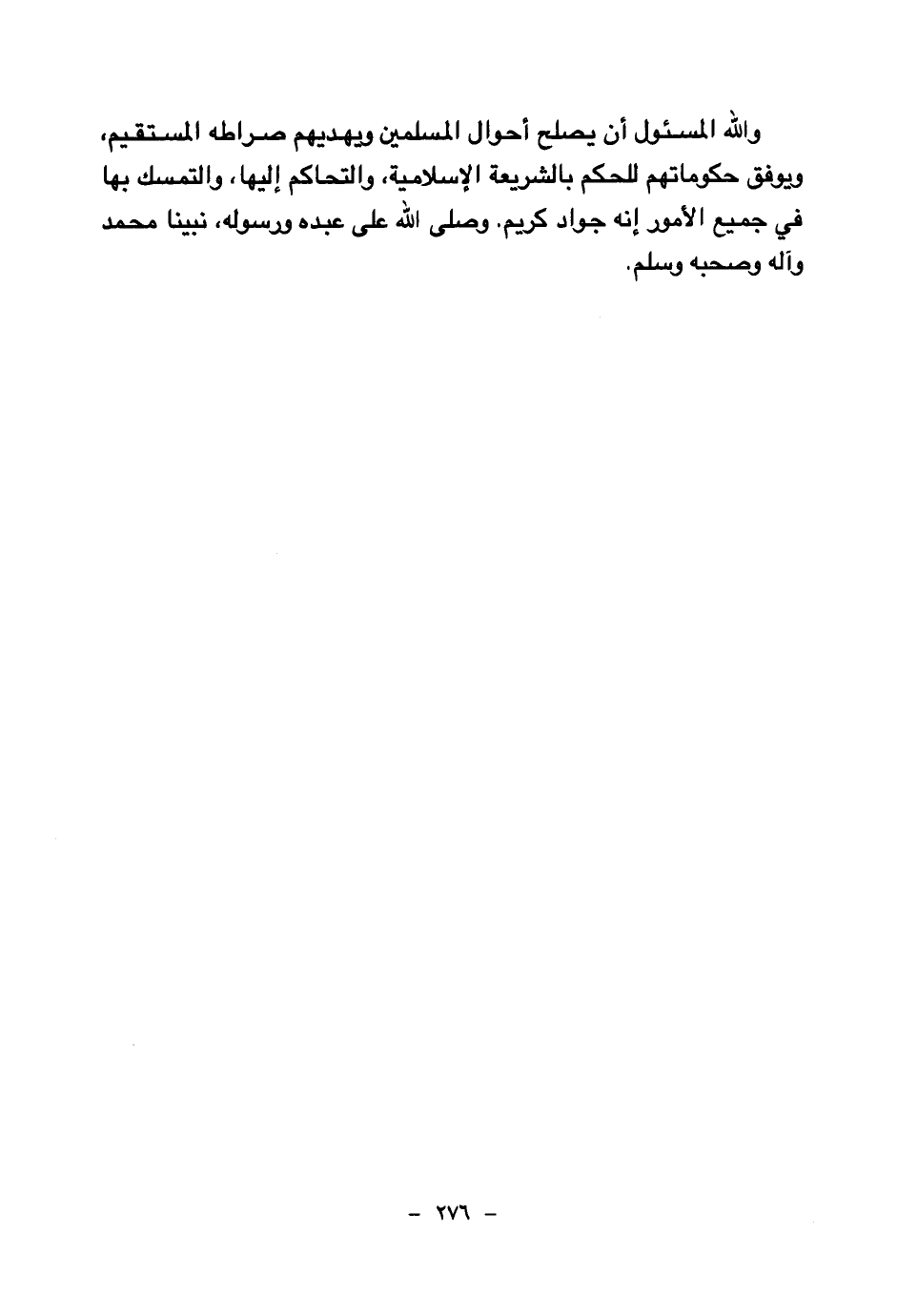 والله المسئول أن يصلح أحوال المسلمين ويهديهم صراطه المستقيم، ويوفق حكوماتهم للحكم بالشريعة الإسلامية، والتحاكم إليها، والتمسك بها في جميع الأمور إنه جواد كريم.