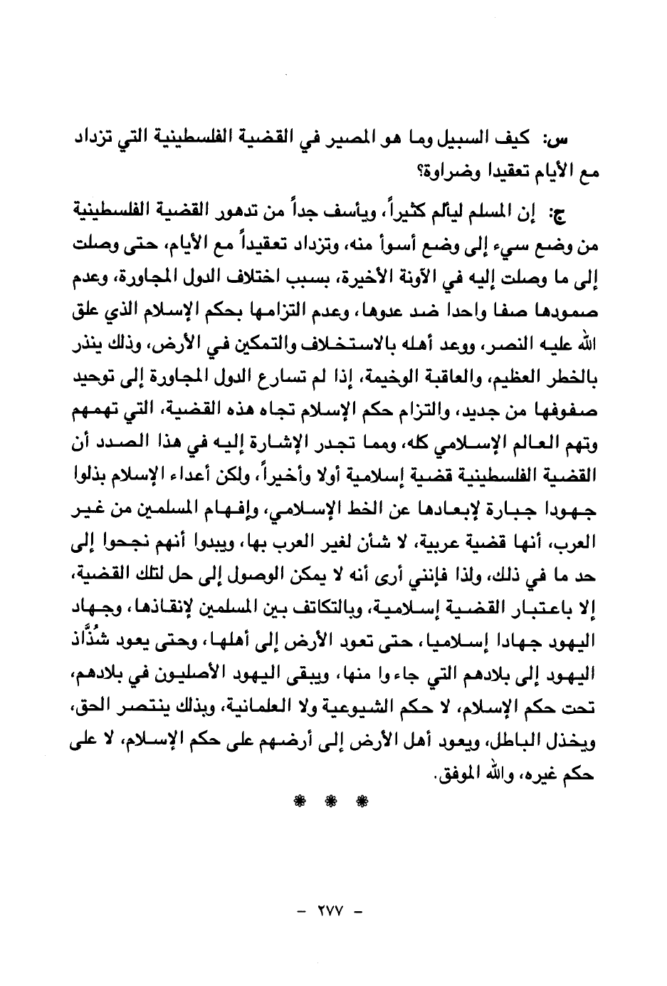 س: كيف السبيل وما هو المصير في القضية الفلسطينية التي تزداد مع الأيام تعقيدا وضراوة؟