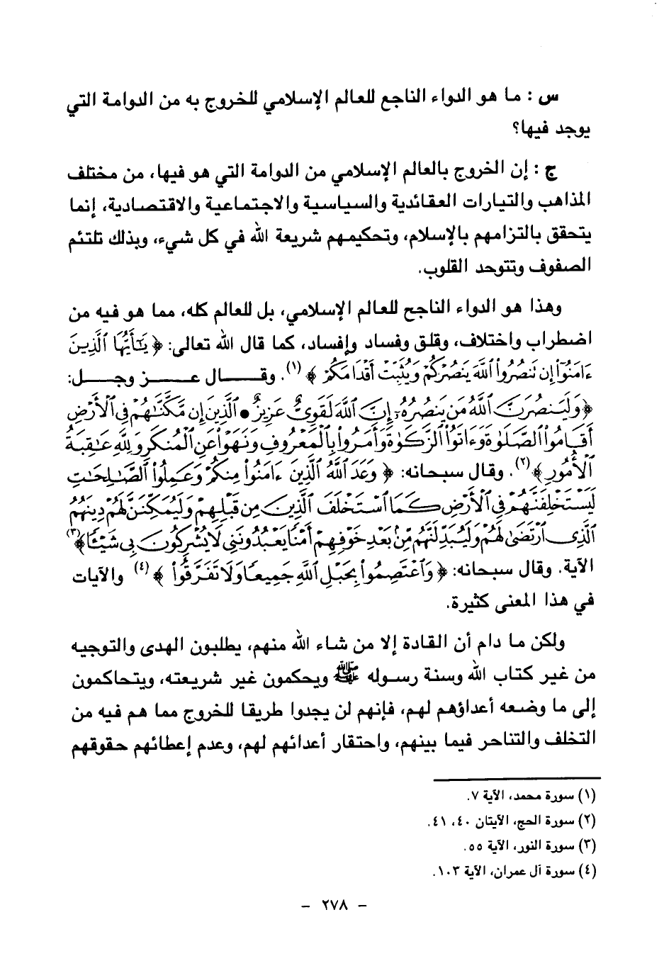 وهذا هو الدواء الناجح للعالم الإسلامي، بل للعالم كله، مما هو فيه من اضطراب واختلاف، وقلق وفساد وإفساد، كما قال الله تعالى: {يَا أَيُّهَا الَّذِينَ آمَنُوا إِنْ تَنْصُرُوا اللَّهَ يَنْصُرْكُمْ وَيُثَبِّتْ أَقْدَامَكُمْ} (¬1) وقال عز وجل: {وَلَيَنْصُرَنَّ اللَّهُ مَنْ يَنْصُرُهُ إِنَّ اللَّهَ لَقَوِيٌّ عَزِيزٌ} (¬2) {الَّذِينَ إِنْ مَكَّنَّاهُمْ فِي الْأَرْضِ أَقَامُوا الصَّلَاةَ وَآتَوُا الزَّكَاةَ وَأَمَرُوا بِالْمَعْرُوفِ وَنَهَوْا عَنِ الْمُنْكَرِ وَلِلَّهِ عَاقِبَةُ الْأُمُورِ} (¬3) وقال سبحانه: {وَعَدَ اللَّهُ الَّذِينَ آمَنُوا مِنْكُمْ وَعَمِلُوا الصَّالِحَاتِ لَيَسْتَخْلِفَنَّهُمْ فِي الْأَرْضِ كَمَا اسْتَخْلَفَ الَّذِينَ مِنْ قَبْلِهِمْ وَلَيُمَكِّنَنَّ لَهُمْ دِينَهُمُ الَّذِي ارْتَضَى لَهُمْ وَلَيُبَدِّلَنَّهُمْ مِنْ بَعْدِ خَوْفِهِمْ أَمْنًا يَعْبُدُونَنِي لَا يُشْرِكُونَ بِي شَيْئًا} (¬4) الآية وقال سبحانه: {وَاعْتَصِمُوا بِحَبْلِ اللَّهِ جَمِيعًا وَلَا تَفَرَّقُوا} (¬5) والآيات في هذا المعنى كثيرة.