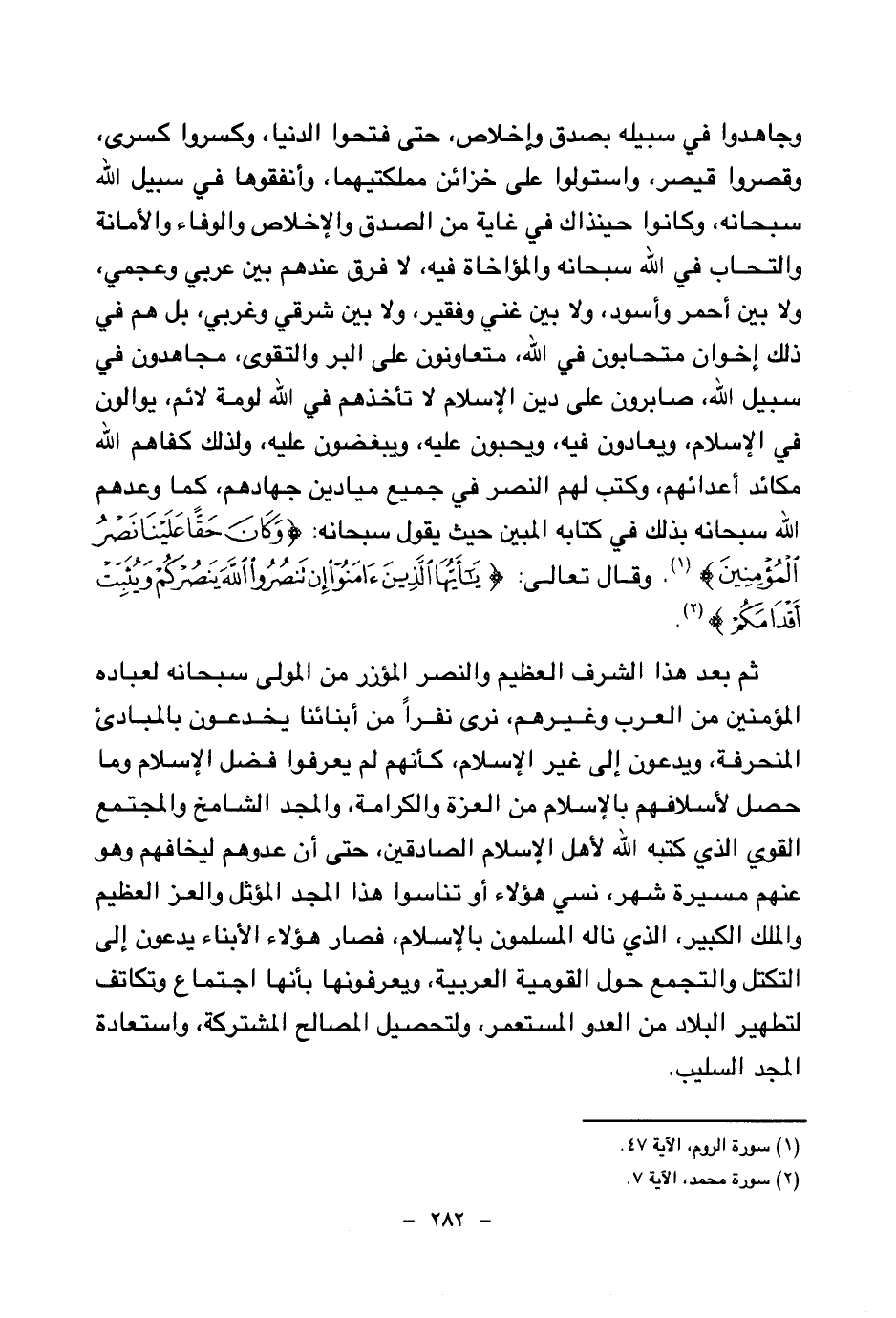 وجاهدوا في سبيله بصدق وإخلاص، حتى فتحوا الدنيا، وكسروا كسرى، وقصروا قيصر، واستولوا على خزائن مملكتيهما، وأنفقوها في سبيل الله سبحانه، وكانوا حينذاك في غاية من الصدق والإخلاص والوفاء والأمانة والتحاب في الله سبحانه والمؤاخاة فيه، لا فرق عندهم بين عربي وعجمي، ولا بين أحمر وأسود، ولا بين غني وفقير، ولا بين شرقي وغربي، بل هم في ذلك إخوان متحابون في الله، متعاونون على البر والتقوى، مجاهدون في سبيل الله، صابرون على دين الإسلام لا تأخذهم في الله لومة لائم، يوالون في الإسلام، ويعادون فيه، ويحبون عليه، ويبغضون عليه، ولذلك كفاهم الله مكائد أعدائهم، وكتب لهم النصر في جميع ميادين جهادهم، كما وعدهم الله سبحانه بذلك في كتابه المبين حيث يقول سبحانه: {وَكَانَ حَقًّا عَلَيْنَا نَصْرُ الْمُؤْمِنِينَ} (¬1) وقال تعالى: {يَا أَيُّهَا الَّذِينَ آمَنُوا إِنْ تَنْصُرُوا اللَّهَ يَنْصُرْكُمْ وَيُثَبِّتْ أَقْدَامَكُمْ} (¬2)