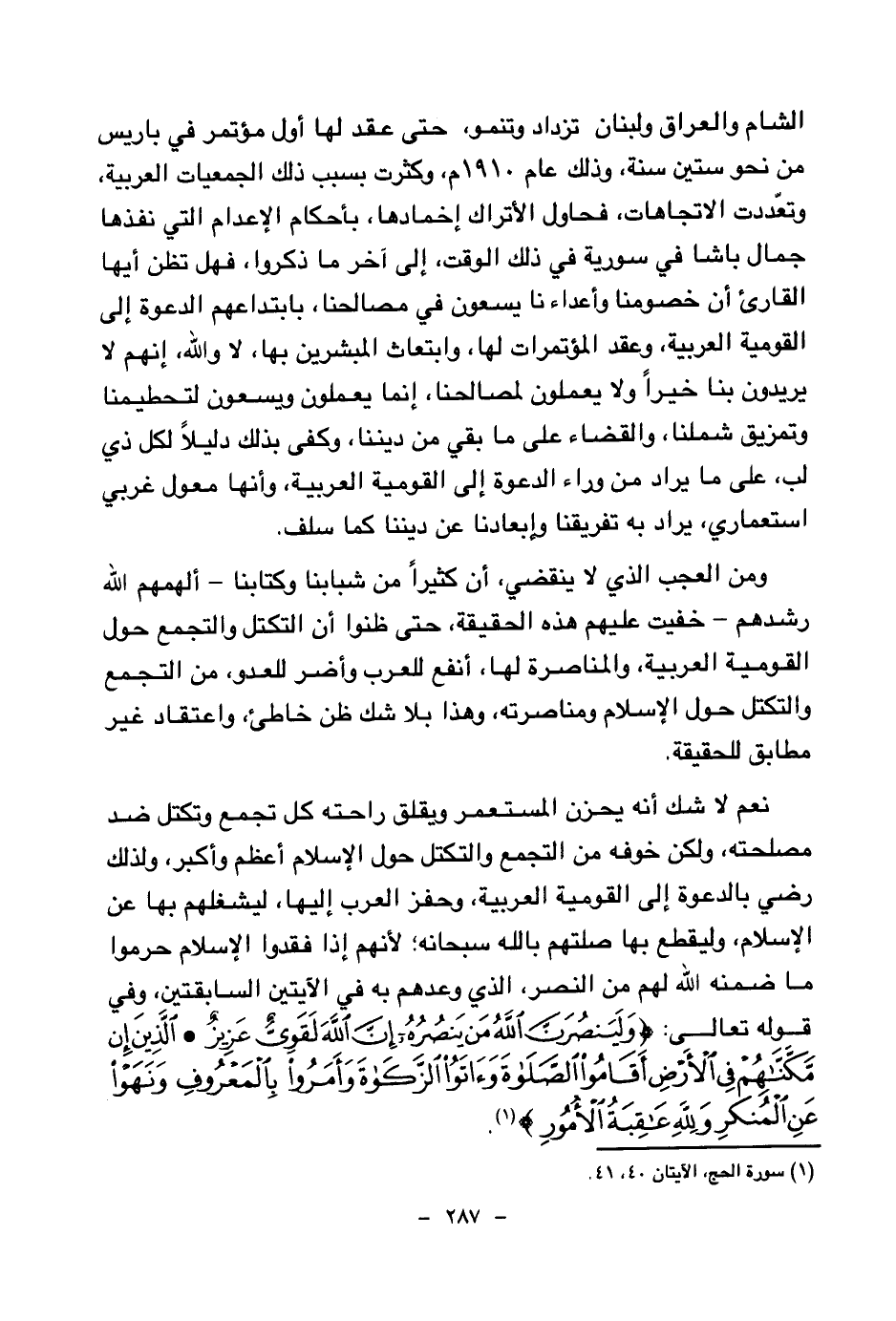 نعم لا شك أنه يحزن المستعمر ويقلق راحته كل تجمع وتكتل ضد مصلحته، ولكن خوفه من التجمع والتكتل حول الإسلام أعظم وأكبر، ولذلك رضي بالدعوة إلى القومية العربية، وحفز العرب إليها، ليشغلهم بها عن الإسلام، وليقطع بها صلتهم بالله سبحانه؛ لأنهم إذا فقدوا الإسلام حرموا ما ضمنه الله لهم من النصر، الذي وعدهم به في الآيتين السابقتين، وفي قوله تعالى: {وَلَيَنْصُرَنَّ اللَّهُ مَنْ يَنْصُرُهُ إِنَّ اللَّهَ لَقَوِيٌّ عَزِيزٌ} (¬1) {الَّذِينَ إِنْ مَكَّنَّاهُمْ فِي الْأَرْضِ أَقَامُوا الصَّلَاةَ وَآتَوُا الزَّكَاةَ وَأَمَرُوا بِالْمَعْرُوفِ وَنَهَوْا عَنِ الْمُنْكَرِ وَلِلَّهِ عَاقِبَةُ الْأُمُورِ} (¬2)