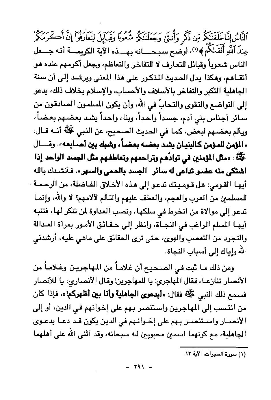 {يَا أَيُّهَا النَّاسُ إِنَّا خَلَقْنَاكُمْ مِنْ ذَكَرٍ وَأُنْثَى وَجَعَلْنَاكُمْ شُعُوبًا وَقَبَائِلَ لِتَعَارَفُوا إِنَّ أَكْرَمَكُمْ عِنْدَ اللَّهِ أَتْقَاكُمْ} (¬1) أوضح سبحانه بهذه الآية الكريمة أنه جعل الناس شعوبا وقبائل للتعارف لا للتفاخر والتعاظم، وجعل أكرمهم عنده هو أتقاهم، وهكذا يدل الحديث المذكور على هذا المعنى ويرشد إلى سنة الجاهلية التكبر والتفاخر بالأسلاف والأحساب، والإسلام بخلاف ذلك، يدعو إلى التواضع والتقوى والتحاب في الله، وأن يكون المسلمون الصادقون من سائر أجناس بني آدم، جسدا واحدا، وبناء واحدا يشد بعضهم بعضا، ويألم بعضهم لبعض، كما في الحديث الصحيح، عن النبي صلى الله عليه وسلم أنه قال: «المؤمن للمؤمن كالبنيان يشد بعضه بعضا وشبك بين أصابعه (¬2) » وقال صلى الله عليه وسلم: «مثل المؤمنين في توادهم وتراحمهم وتعاطفهم مثل الجسد الواحد إذا اشتكى منه عضو تداعى له سائر الجسد بالحمى والسهر (¬3) » فأنشدك بالله أيها القومي: هل قوميتك تدعو إلى هذه الأخلاق الفاضلة، من الرحمة للمسلمين من العرب والعجم، والعطف عليهم والتألم لآلامهم؟ لا والله، وإنما تدعو إلى موالاة من انخرط في سلكها، ونصب العداوة لمن تنكر لها، فتنبه أيها المسلم الراغب في النجاة، وانظر إلى حقائق الأمور بمرآة العدالة والتجرد من التعصب والهوى، حتى ترى الحقائق على ما هي عليه، أرشدني الله وإياك إلى أسباب النجاة.