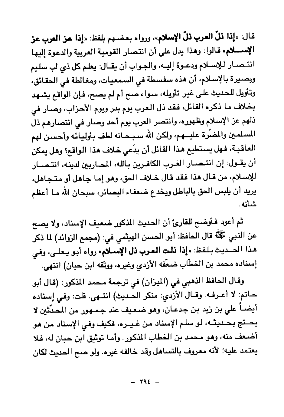 قال: «إذا ذل العرب ذل الإسلام» ورواه بعضهم بلفظ: «إذا عز العرب عز الإسلام» قالوا: وهذا يدل علي أن انتصار القومية العربية والدعوة إليها انتصار للإسلام ودعوة إليه، والجواب أن يقال: يعلم كل ذي لب سليم وبصيرة بالإسلام، أن هذه سفسطة في السمعيات، ومغالطة في الحقائق، وتأويل للحديث على غير تأويله، سواء صح أم لم يصح، فإن الواقع يشهد بخلاف ما ذكره القائل، فقد ذل العرب يوم بدر ويوم الأحزاب، وصار في ذلهم عز الإسلام وظهوره، وانتصر العرب يوم أحد وصار في انتصارهم ذل المسلمين والمضرة عليهم، ولكن الله سبحانه لطف بأوليائه وأحسن لهم العاقبة، فهل يستطيع هذا القائل أن يدعي خلاف هذا الواقع؟ وهل يمكن أن يقول: إن انتصار العرب الكافرين بالله، المحاربين لدينه، انتصار للإسلام، من قال هذا فقد قال خلاف الحق، وهو إما جاهل أو متجاهل، يريد أن يلبس الحق بالباطل ويخدع ضعفاء البصائر، سبحان الله ما أعظم شأنه.