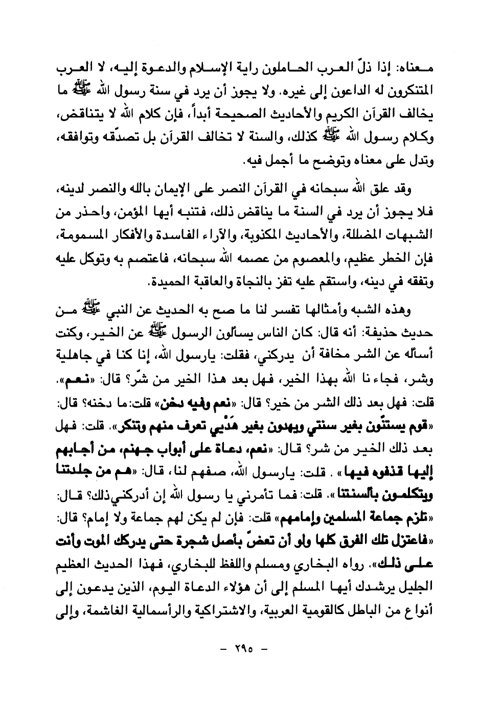 وهذه الشبه وأمثالها تفسر لنا ما صح به الحديث عن النبي صلى الله عليه وسلم من حديث حذيفة: أنه قال: «كان الناس يسألون الرسول صلى الله عليه وسلم عن الخير، وكنت أسأله عن الشر مخافة أن يدركني، فقلت: يا رسول الله، إنا كنا في جاهلية وشر، فجاءنا الله بهذا الخير، فهل بعد هذا الخير من شر؟ قال: نعم، قلت: فهل بعد ذلك الشر من خير؟ قال: نعم وفيه دخن، قلت: ما دخنه؟ قال: قوم يستنون بغير سنتي ويهدون بغير هديي تعرف منهم وتنكر، قلت: فهل بعد ذلك الخير من شر؟ قال: نعم، دعاة على أبواب جهنم، من أجابهم إليها قذفوه فيها، قلت: يا رسول الله، صفهم لنا، قال: هم من جلدتنا ويتكلمون بألسنتنا، قلت: فما تأمرني يا رسول الله إن أدركني ذلك؟ قال: لتلزم جماعة المسلمين وإمامهم، قلت: فإن لم يكن لهم جماعة ولا إمام؟ قال: فاعتزل تلك الفرق كلها ولو أن تعض بأصل شجرة حتى يدركك الموت وأنت على ذلك (¬1) » . رواه البخاري ومسلم واللفظ للبخاري، فهذا الحديث العظيم الجليل يرشدك أيها المسلم إلى أن هؤلاء الدعاة اليوم، الذين يدعون إلى أنواع من الباطل كالقومية العربية، والاشتراكية والرأسمالية الغاشمة، وإلى