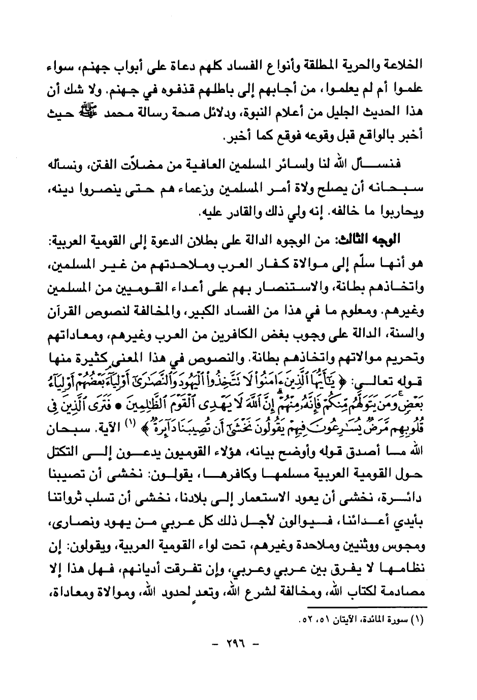 الوجه الثالث من الوجوه الدالة على بطلان الدعوة إلى القومية العربية: هو أنها سلم إلى موالاة كفار العرب وملاحدتهم من غير المسلمين، واتخاذهم بطانة، والاستنصار بهم على أعداء القوميين من المسلمين وغيرهم. ومعلوم ما في هذا من الفساد الكبير، والمخالفة لنصوص القرآن والسنة، الدالة على وجوب بغض الكافرين من العرب وغيرهم، ومعاداتهم وتحريم موالاتهم واتخاذهم بطانة. والنصوص في هذا المعنى كثيرة منها قوله تعالى: {يَا أَيُّهَا الَّذِينَ آمَنُوا لَا تَتَّخِذُوا الْيَهُودَ وَالنَّصَارَى أَوْلِيَاءَ بَعْضُهُمْ أَوْلِيَاءُ بَعْضٍ وَمَنْ يَتَوَلَّهُمْ مِنْكُمْ فَإِنَّهُ مِنْهُمْ إِنَّ اللَّهَ لَا يَهْدِي الْقَوْمَ الظَّالِمِينَ} (¬1) {فَتَرَى الَّذِينَ فِي قُلُوبِهِمْ مَرَضٌ يُسَارِعُونَ فِيهِمْ يَقُولُونَ نَخْشَى أَنْ تُصِيبَنَا دَائِرَةٌ} (¬2) الآية. سبحان الله ما أصدق قوله وأوضح بيانه، هؤلاء القوميون يدعون إلى التكتل حول القومية العربية مسلمها وكافرها، يقولون: نخشى أن تصيبنا دائرة، نخشى أن يعود الاستعمار إلى بلادنا، نخشى أن تسلب ثرواتنا بأيدي أعدائنا، فيوالون لأجل ذلك كل عربي من يهود ونصارى، ومجوس ووثنيين وملاحدة وغيرهم، تحت لواء القومية العربية، ويقولون: إن نظامها لا يفرق بين عربي وعربي، وإن تفرقت أديانهم، فهل هذا إلا مصادمة لكتاب الله، ومخالفة لشرع الله، وتعد لحدود الله، وموالاة ومعاداة،