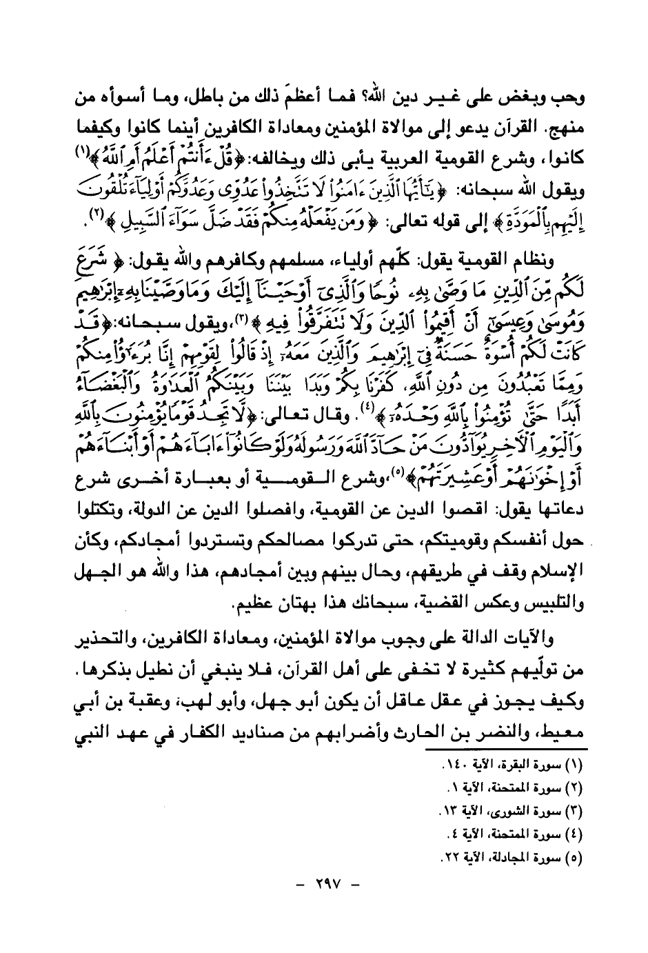 وحب وبغض على غير دين الله؟ فما أعظم ذلك من باطل، وما أسوأه من منهج. والقرآن يدعو إلى موالاة المؤمنين ومعاداة الكافرين أينما كانوا وكيفما كانوا، وشرع القومية العربية يأبى ذلك ويخالفه: {قُلْ أَأَنْتُمْ أَعْلَمُ أَمِ اللَّهُ} (¬1) ويقول الله سبحانه: {يَا أَيُّهَا الَّذِينَ آمَنُوا لَا تَتَّخِذُوا عَدُوِّي وَعَدُوَّكُمْ أَوْلِيَاءَ تُلْقُونَ إِلَيْهِمْ بِالْمَوَدَّةِ} (¬2) إلى قوله تعالى {وَمَنْ يَفْعَلْهُ مِنْكُمْ فَقَدْ ضَلَّ سَوَاءَ السَّبِيلِ} (¬3)