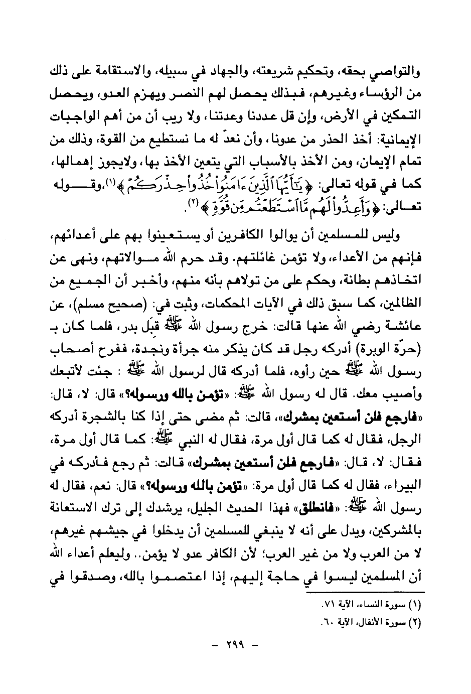 وليس للمسلمين أن يوالوا الكافرين أو يستعينوا بهم على أعدائهم، فإنهم من الأعداء ولا تؤمن غائلتهم. وقد حرم الله موالاتهم، ونهى عن اتخاذهم بطانة، وحكم على من تولاهم بأنه منهم، وأخبر أن الجميع من الظالمين، كما سبق ذلك في الآيات المحكمات، وثبت في: (صحيح مسلم) ، عن عائشة رضي الله عنها قالت: «خرج رسول الله صلى الله عليه وسلم قبل بدر، فلما كان بـ (حرة الوبرة) أدركه رجل قد كان يذكر منه جرأة ونجدة، ففرح أصحاب رسول الله صلى الله عليه وسلم حين رأوه، فلما أدركه قال لرسول الله صلى الله عليه وسلم: جئت لأتبعك وأصيب معك. قال له رسول الله صلى الله عليه وسلم " تؤمن بالله ورسوله؟ " قال: لا، قال " فارجع فلن استعين بمشرك " قالت: ثم مضى حتى إذا كنا بالشجرة أدركه الرجل، فقال له كما قال أول مرة، فقال له النبي صلى الله عليه وسلم كما قال أول مرة، فقال: لا، قال " فارجع فلن استعين بمشرك " قالت: ثم رجع فأدركه في البيراء، فقال له كما قال أول مرة: " تؤمن بالله ورسوله؟ " قال: نعم، فقال له رسول الله صلى الله عليه وسلم: " فانطلق (¬3) » فهذا الحديث الجليل، يرشدك إلى ترك الاستعانة بالمشركين، ويدل على أنه لا ينبغي للمسلمين أن يدخلوا في جيشهم غيرهم، لا من العرب ولا من غير العرب؛ لأن الكافر عدو لا يؤمن. وليعلم أعداء الله أن المسلمين ليسوا في حاجة إليهم، إذا اعتصموا بالله، وصدقوا في