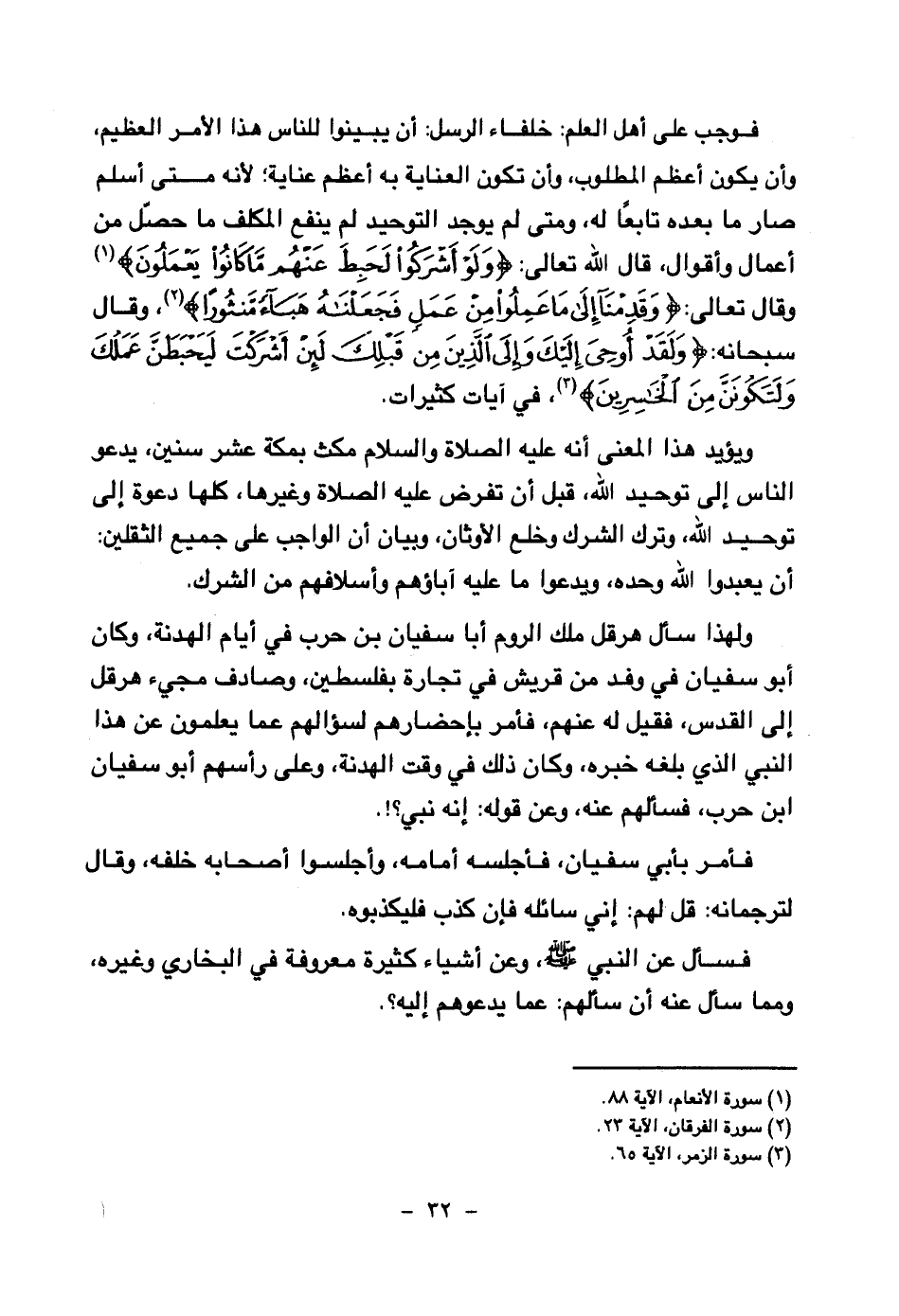 فوجب على أهل العلم: خلفاء الرسل: أن يبينوا للناس هذا الأمر العظيم، وأن يكون أعظم المطلوب، وأن تكون العناية به أعظم عناية؛ لأنه متى أسلم صار ما بعده تابعا له، ومتى لم يوجد التوحيد لم ينفع المكلف ما حصل من أعمال وأقوال، قال الله تعالى: {وَلَوْ أَشْرَكُوا لَحَبِطَ عَنْهُمْ مَا كَانُوا يَعْمَلُونَ} (¬1) وقال تعالى: {وَقَدِمْنَا إِلَى مَا عَمِلُوا مِنْ عَمَلٍ فَجَعَلْنَاهُ هَبَاءً مَنْثُورًا} (¬2) وقال سبحانه: {وَلَقَدْ أُوحِيَ إِلَيْكَ وَإِلَى الَّذِينَ مِنْ قَبْلِكَ لَئِنْ أَشْرَكْتَ لَيَحْبَطَنَّ عَمَلُكَ وَلَتَكُونَنَّ مِنَ الْخَاسِرِينَ} (¬3) في آيات كثيرات.