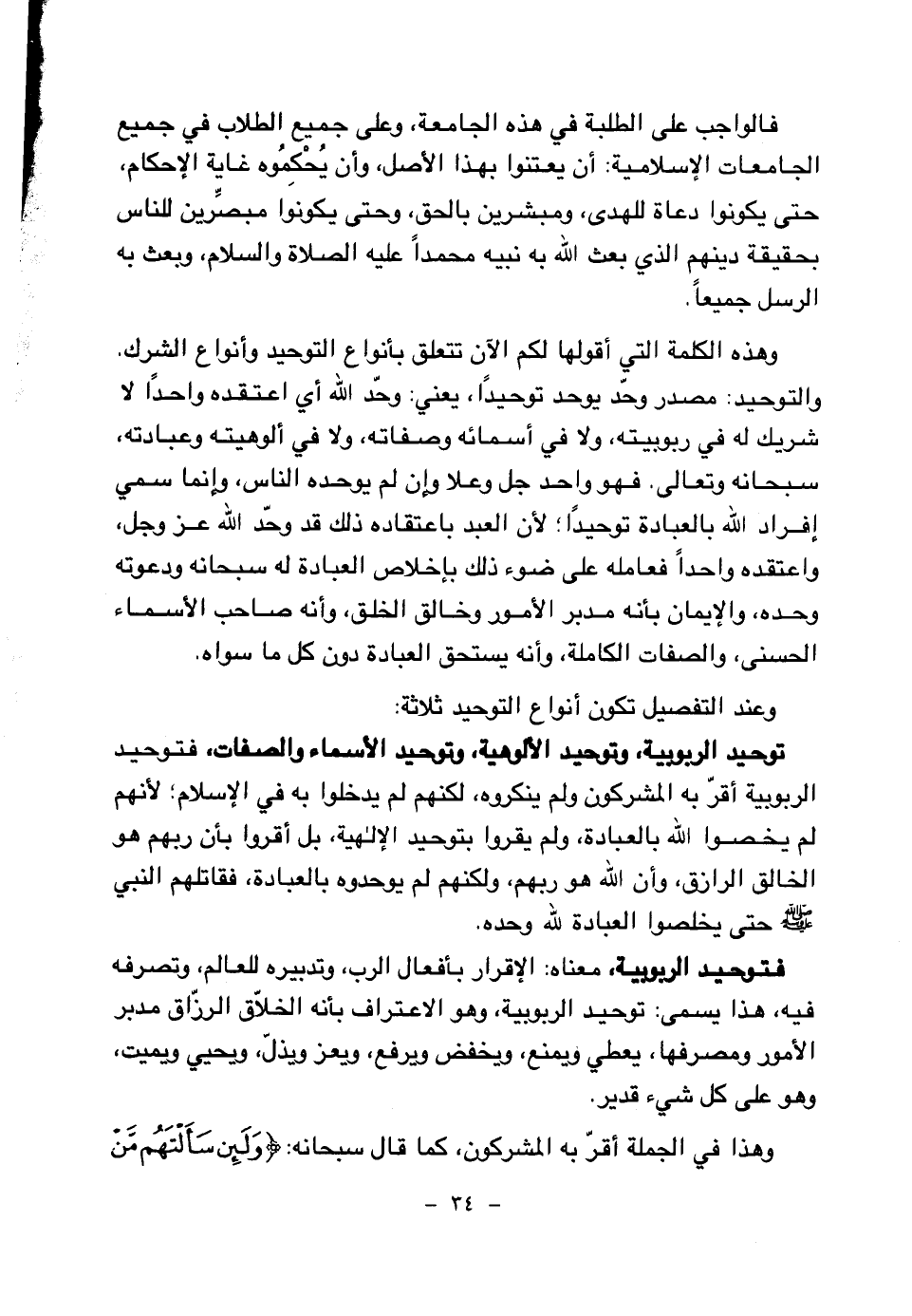 فالواجب على الطلبة في هذه الجامعة، وعلى جميع الطلاب في جميع الجامعات الإسلامية: أن يعتنوا بهذا الأصل، وأن يحكموه غاية الإحكام، حتى يكونوا دعاة للهدى، ومبشرين بالحق، وحتى يكونوا مبصرين للناس بحقيقة دينهم الذي بعث الله به نبيه محمدا عليه الصلاة والسلام، وبعث به الرسل جميعا.