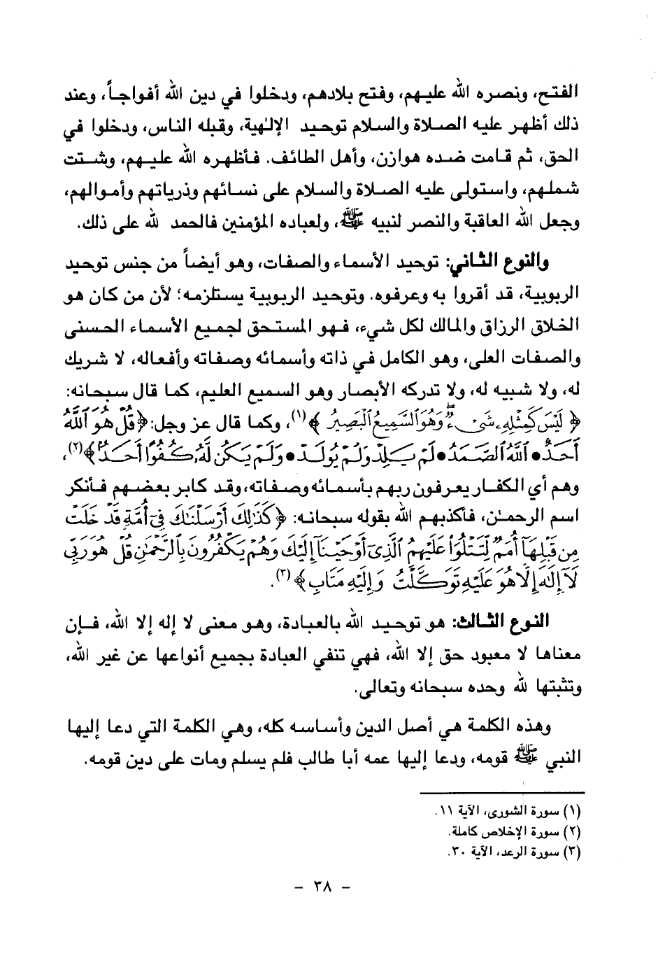 الفتح، ونصره الله عليهم، وفتح بلادهم، ودخلوا في دين الله أفواجا، وعند ذلك أظهر عليه الصلاة والسلام توحيد الإلهية، وقبله الناس، ودخلوا في الحق، ثم قامت ضده هوازن، وأهل الطائف. فأظهره الله عليهم، وشتت شملهم، واستولى عليه الصلاة والسلام على نسائهم وذرياتهم وأموالهم، وجعل الله العاقبة والنصر لنبيه صلى الله عليه وسلم، ولعباده المؤمنين فالحمد لله على ذلك.