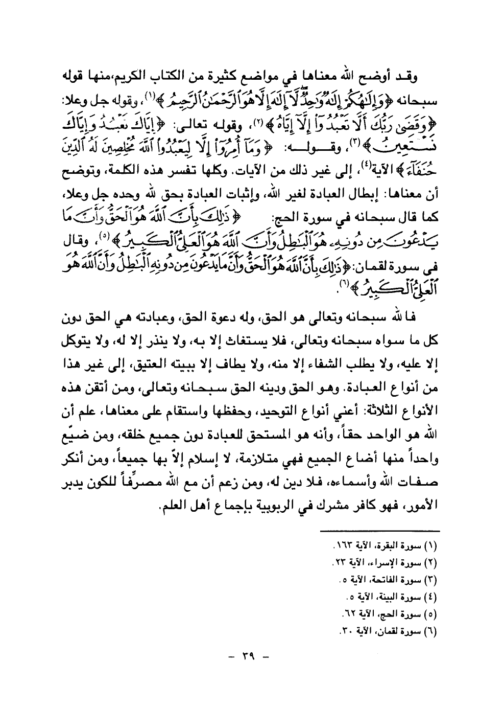 وقد أوضح الله معناها في مواضع كثيرة من الكتاب الكريم، منها قوله سبحانه {وَإِلَهُكُمْ إِلَهٌ وَاحِدٌ لَا إِلَهَ إِلَّا هُوَ الرَّحْمَنُ الرَّحِيمُ} (¬1) وقوله جل وعلا: {وَقَضَى رَبُّكَ أَلَّا تَعْبُدُوا إِلَّا إِيَّاهُ} (¬2) وقوله تعالى: {إِيَّاكَ نَعْبُدُ وَإِيَّاكَ نَسْتَعِينُ} (¬3) وقوله: {وَمَا أُمِرُوا إِلَّا لِيَعْبُدُوا اللَّهَ مُخْلِصِينَ لَهُ الدِّينَ حُنَفَاءَ} (¬4) الآية، إلى غير ذلك من الآيات. وكلها تفسر هذه الكلمة، وتوضح أن معناها: إبطال العبادة لغير الله، وإثبات العبادة بحق لله وحده جل وعلا، كما قال سبحانه في سورة الحج: {ذَلِكَ بِأَنَّ اللَّهَ هُوَ الْحَقُّ وَأَنَّ مَا يَدْعُونَ مِنْ دُونِهِ هُوَ الْبَاطِلُ وَأَنَّ اللَّهَ هُوَ الْعَلِيُّ الْكَبِيرُ} (¬5) وقال في سورة لقمان: {ذَلِكَ بِأَنَّ اللَّهَ هُوَ الْحَقُّ وَأَنَّ مَا يَدْعُونَ مِنْ دُونِهِ الْبَاطِلُ وَأَنَّ اللَّهَ هُوَ الْعَلِيُّ الْكَبِيرُ} (¬6)