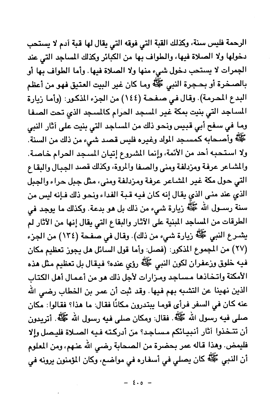 الرحمة فليس سنة، وكذلك القبة التي فوقه التي يقال لها قبة آدم لا يستحب دخولها ولا الصلاة فيها، والطواف بها من الكبائر وكذلك المساجد التي عند الجمرات لا يستحب دخول شيء منها ولا الصلاة فيها، وأما الطواف بها أو بالصخرة أو بحجرة النبي صلى الله عليه وسلم وما كان غير البيت العتيق فهو من أعظم البدع المحرمة) . وقال في صفحة (144) من الجزء المذكور: (وأما زيارة المساجد التي بنيت بمكة غير المسجد الحرام كالمسجد الذي تحت الصفا وما في سفح أبي قبيس ونحو ذلك من المساجد التي بنيت على آثار النبي صلى الله عليه وسلم وأصحابه كمسجد المولد وغيره فليس قصد شيء من ذلك من السنة، ولا استحبه أحد من الأئمة، وإنما المشروع إتيان المسجد الحرام خاصة، والمشاعر عرفة ومزدلفة ومنى والصفا والمروة، وكذلك قصد الجبال والبقاع التي حول مكة غير المشاعر عرفة ومزدلفة ومنى، مثل جبل حراء والجبل الذي عند منى الذي يقال إنه كان فيه قبة الفداء ونحو ذلك فإنه ليس من سنة رسول الله صلى الله عليه وسلم زيارة شيء من ذلك بل هو بدعة. وكذلك ما يوجد في الطرقات من المساجد المبنية على الآثار والبقاع التي يقال إنها من الآثار لم يشرع النبي صلى الله عليه وسلم زيارة شيء من ذلك) ، وقال في صفحة (134) من الجزء (27) من المجموع المذكور: (فصل: وأما قول السائل هل يجوز تعظيم مكان فيه خلوق وزعفران لكون النبي صلى الله عليه وسلم رؤي عنده؟ فيقال بل تعظيم مثل هذه الأمكنة واتخاذها مساجد ومزارات لأجل ذلك هو من أعمال أهل الكتاب الذين نهينا عن التشبه بهم فيها، وقد ثبت أن عمر بن الخطاب رضي الله عنه كان في السفر فرأى قوما يبتدرون مكانا فقال: ما هذا؟ فقالوا: مكان صلى فيه رسول الله صلى الله عليه وسلم، فقال: ومكان صلى فيه رسول الله صلى الله عليه وسلم أتريدون أن تتخذوا آثار أنبيائكم مساجد؟ من أدركته فيه الصلاة فليصل وإلا فليمض، وهذا قاله عمر بحضرة من الصحابة رضي الله عنهم، ومن المعلوم أن النبي صلى الله عليه وسلم كان يصلي في أسفاره في مواضع، وكان المؤمنون يرونه في