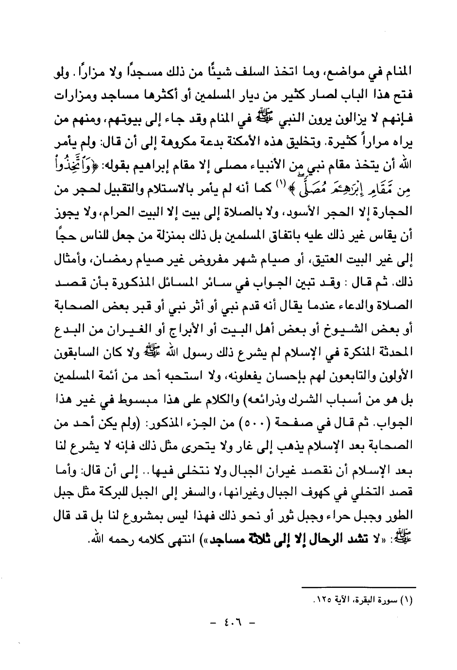 المنام في مواضع، وما اتخذ السلف شيئا من ذلك مسجدا ولا مزارا، ولو فتح هذا الباب لصار كثير من ديار المسلمين أو أكثرها مساجد ومزارات فإنهم لا يزالون يرون النبي صلى الله عليه وسلم في المنام وقد جاء إلى بيوتهم، ومنهم من يراه مرارا كثيرة، وتخليق هذه الأمكنة بدعة مكروهة إلى أن قال: ولم يأمر الله أن يتخذ مقام نبي من الأنبياء مصلى إلا مقام إبراهيم بقوله: {وَاتَّخِذُوا مِنْ مَقَامِ إِبْرَاهِيمَ مُصَلًّى} (¬1) كما أنه لم يأمر بالاستلام والتقبيل لحجر من الحجارة إلا الحجر الأسود، ولا بالصلاة إلى بيت إلا البيت الحرام، ولا يجوز أن يقاس غير ذلك عليه باتفاق المسلمين بل ذلك بمنزلة من جعل للناس حجا إلى غير البيت العتيق، أو صيام شهر مفروض غير صيام رمضان، وأمثال ذلك. ثم قال: وقد تبين الجواب في سائر المسائل المذكورة بأن قصد الصلاة والدعاء عندما يقال أنه قدم نبي أو أثر نبي أو قبر بعض الصحابة أو بعض الشيوخ أو بعض أهل البيت أو الأبراج أو الغيران من البدع المحدثة المنكرة في الإسلام لم يشرع ذلك رسول الله صلى الله عليه وسلم ولا كان السابقون الأولون والتابعون لهم بإحسان يفعلونه، ولا استحبه أحد من أئمة المسلمين بل هو من أسباب الشرك وذرائعه) والكلام على هذا مبسوط في غير هذا الجواب، ثم قال في صفحة (500) من الجزء المذكور: (ولم يكن أحد من الصحابة بعد الإسلام يذهب إلى غار ولا يتحرى مثل ذلك فإنه لا يشرع لنا بعد الإسلام أن نقصد غيران الجبال ولا نتخلى فيها.. إلى أن قال: وأما قصد التخلي في كهوف الجبال وغيرانها، والسفر إلى الجبل للبركة مثل جبل الطور وجبل حراء وجبل ثور أو نحو ذلك فهذا ليس بمشروع لنا بل قد قال صلى الله عليه وسلم: «لا تشد الرحال إلا إلى ثلاثة مساجد (¬2) » انتهى كلامه رحمه الله.