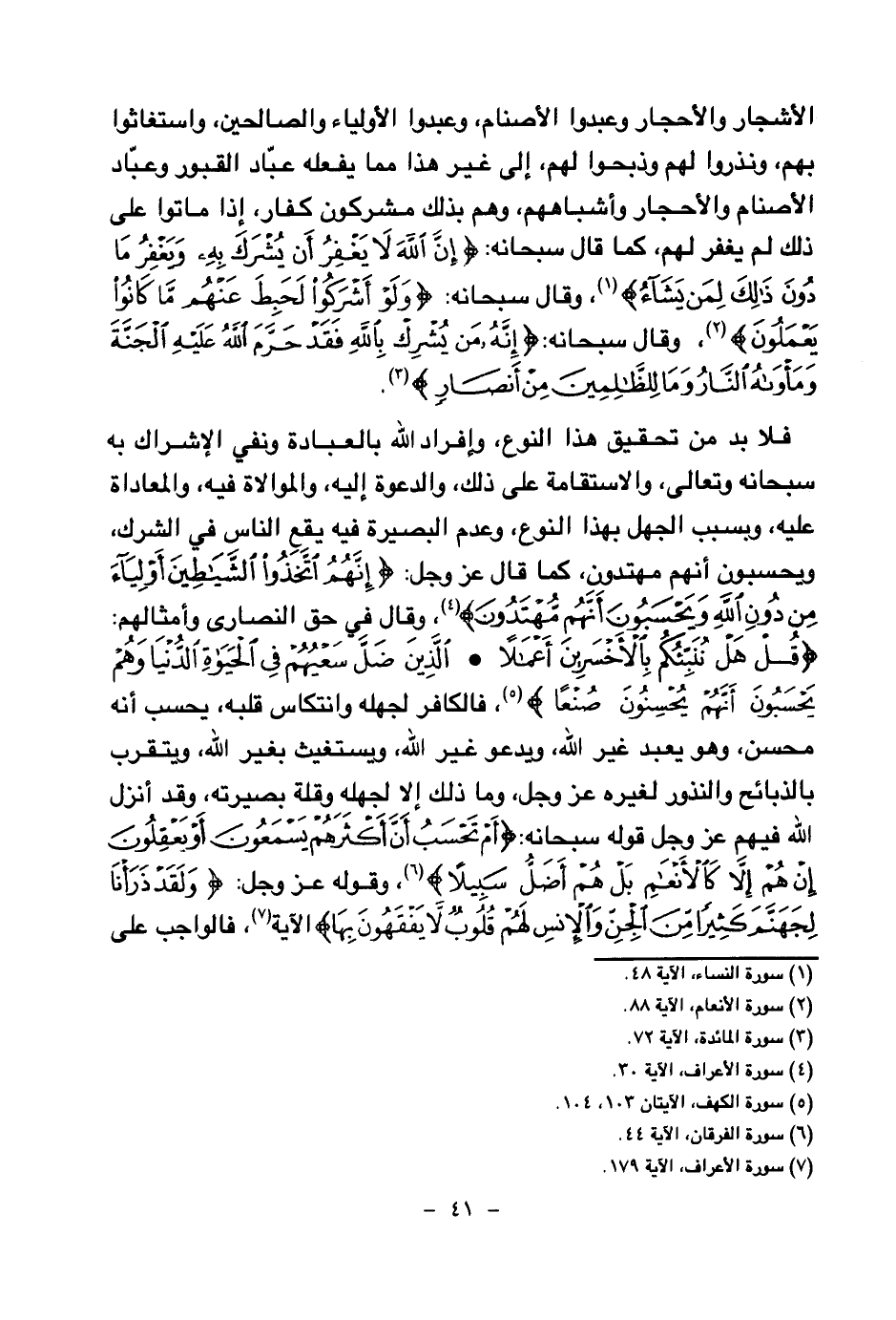 فلا بد من تحقيق هذا النوع، وإفراد الله بالعبادة ونفي الإشراك به سبحانه وتعالى، والاستقامة على ذلك، والدعوة إليه، والموالاة فيه، والمعاداة عليه، وبسبب الجهل بهذا النوع، وعدم البصيرة فيه يقع الناس في الشرك ويحسبون أنهم مهتدون، كما قال عز وجل: {إِنَّهُمُ اتَّخَذُوا الشَّيَاطِينَ أَوْلِيَاءَ مِنْ دُونِ اللَّهِ وَيَحْسَبُونَ أَنَّهُمْ مُهْتَدُونَ} (¬4) وقال في حق النصارى وأمثالهم: {قُلْ هَلْ نُنَبِّئُكُمْ بِالْأَخْسَرِينَ أَعْمَالًا} (¬5) {الَّذِينَ ضَلَّ سَعْيُهُمْ فِي الْحَيَاةِ الدُّنْيَا وَهُمْ يَحْسَبُونَ أَنَّهُمْ يُحْسِنُونَ صُنْعًا} (¬6) فالكافر لجهله وانتكاس قلبه، يحسب أنه محسن، وهو يعبد غير الله، ويدعو غير الله، ويستغيث بغير الله، ويتقرب بالذبائح والنذور لغيره عز وجل، وما ذلك إلا لجهله وقلة بصيرته، وقد أنزل الله فيهم عز وجل قوله سبحانه: {أَمْ تَحْسَبُ أَنَّ أَكْثَرَهُمْ يَسْمَعُونَ أَوْ يَعْقِلُونَ إِنْ هُمْ إِلَّا كَالْأَنْعَامِ بَلْ هُمْ أَضَلُّ سَبِيلًا} (¬7) وقوله عز وجل: {وَلَقَدْ ذَرَأْنَا لِجَهَنَّمَ كَثِيرًا مِنَ الْجِنِّ وَالْإِنْسِ لَهُمْ قُلُوبٌ لَا يَفْقَهُونَ بِهَا} (¬8) الآية فالواجب على