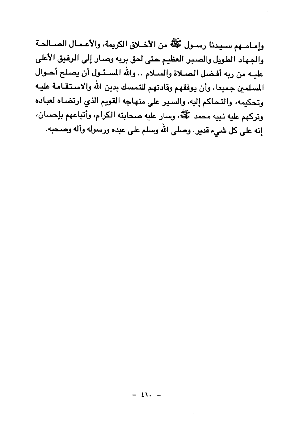 وإمامهم سيدنا رسول الله صلى الله عليه وسلم من الأخلاق الكريمة، والأعمال الصالحة والجهاد الطويل والصبر العظيم حتى لحق بربه وصار إلى الرفيق الأعلى عليه من ربه أفضل الصلاة والسلام. والله المسئول أن يصلح أحوال المسلمين جميعا، وأن يوفقهم وقادتهم للتمسك بدين الله والاستقامة عليه وتحكيمه، والتحاكم إليه، والسير على منهاجه القويم الذي ارتضاه لعباده وتركهم عليه نبيه محمد صلى الله عليه وسلم، وسار عليه صحابته الكرام، وأتباعهم بإحسان، إنه على كل شيء قدير. وصلى الله وسلم على عبده ورسوله وآله وصحبه.