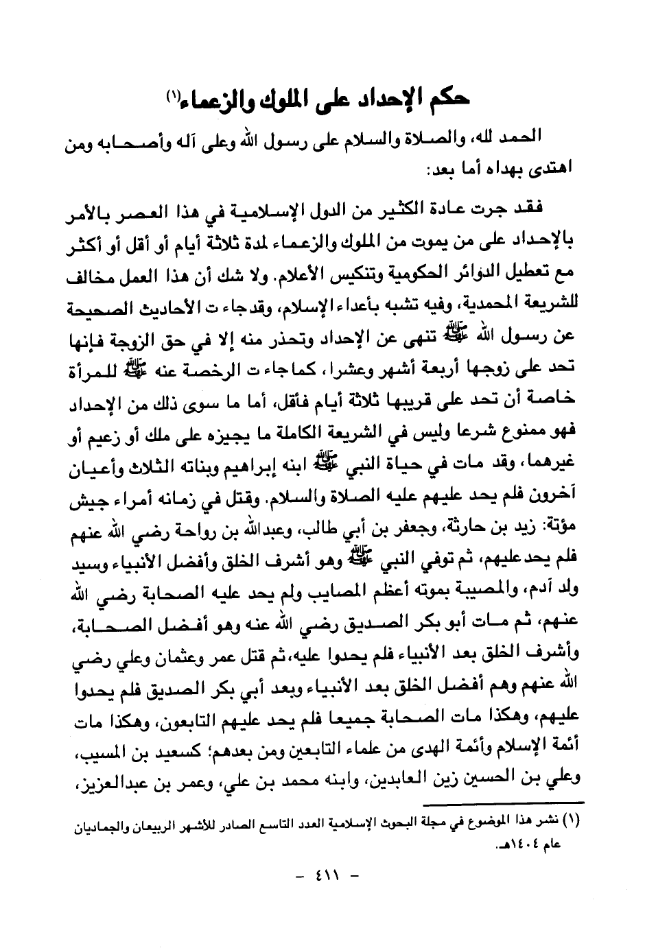 فقد جرت عادة الكثير من الدول الإسلامية في هذا العصر بالأمر بالإحداد على من يموت من الملوك والزعماء لمدة ثلاثة أيام أو أقل أو أكثر مع تعطيل الدوائر الحكومية وتنكيس الأعلام، ولا شك أن هذا العمل مخالف للشريعة المحمدية، وفيه تشبه بأعداء الإسلام، وقد جاءت الأحاديث الصحيحة عن رسول الله صلى الله عليه وسلم تنهى عن الإحداد وتحذر منه إلا في حق الزوجة فإنها تحد على زوجها أربعة أشهر وعشرا، كما جاءت الرخصة عنه صلى الله عليه وسلم للمرأة خاصة أن تحد على قريبها ثلاثة أيام فأقل، أما ما سوى ذلك من الإحداد فهو ممنوع شرعا وليس في الشريعة الكاملة ما يجيزه على ملك أو زعيم أو غيرهما، وقد مات في حياة النبي صلى الله عليه وسلم ابنه إبراهيم وبناته الثلاث وأعيان آخرون فلم يحد عليهم عليه الصلاة والسلام، وقتل في زمانه أمراء جيش مؤتة: زيد بن حارثة، وجعفر بن أبي طالب، وعبد الله بن رواحة رضي الله عنهم فلم يحد عليهم، ثم توفي النبي صلى الله عليه وسلم وهو أشرف الخلق وأفضل الأنبياء وسيد ولد آدم، والمصيبة بموته أعظم المصايب ولم يحد عليه الصحابة رضي الله عنهم، ثم مات أبو بكر الصديق رضي الله عنه وهو أفضل الصحابة، وأشرف الخلق بعد الأنبياء فلم يحدوا عليه، ثم قتل عمر وعثمان وعلي رضي الله عنهم وهم أفضل الخلق بعد الأنبياء وبعد أبي بكر الصديق فلم يحدوا عليهم، وهكذا مات الصحابة جميعا فلم يحد عليهم التابعون، وهكذا مات أئمة الإسلام وأئمة الهدى من علماء التابعين ومن بعدهم؛ كسعيد بن المسيب، وعلي بن الحسين زين العابدين، وابنه محمد بن علي، وعمر بن عبد العزيز،