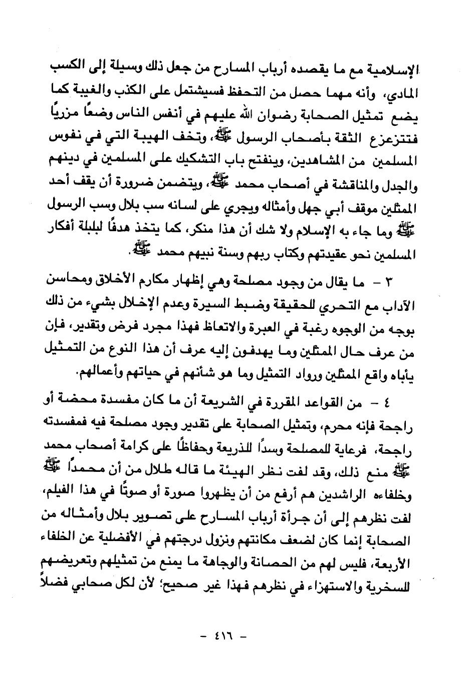 الإسلامية مع ما يقصده أرباب المسارح من جعل ذلك وسيلة إلى الكسب المادي، وأنه مهما حصل من التحفظ فسيشتمل على الكذب والغيبة كما يضع تمثيل الصحابة رضوان الله عليهم في أنفس الناس وضعا مزريا فتتزعزع الثقة بأصحاب الرسول صلى الله عليه وسلم، وتخف الهيبة التي في نفوس المسلمين من المشاهدين، وينفتح باب التشكيك على المسلمين في دينهم والجدل والمناقشة في أصحاب محمد صلى الله عليه وسلم، ويتضمن ضرورة أن يقف أحد الممثلين موقف أبي جهل وأمثاله ويجري على لسانه سب بلال وسب الرسول صلى الله عليه وسلم وما جاء به الإسلام ولا شك أن هذا منكر، كما يتخذ هدفا لبلبلة أفكار المسلمين نحو عقيدتهم وكتاب ربهم وسنة نبيهم محمد صلى الله عليه وسلم.