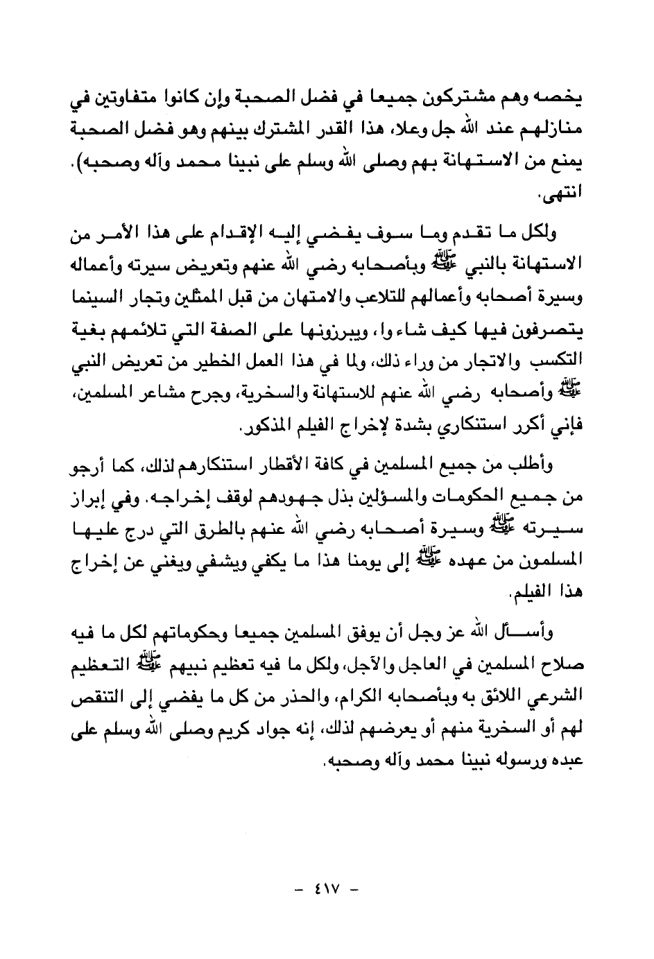 ولكل ما تقدم وما سوف يفضي إليه الإقدام على هذا الأمر من الاستهانة بالنبي صلى الله عليه وسلم وبأصحابه رضي الله عنهم وتعريض سيرته وأعماله وسيرة أصحابه وأعمالهم للتلاعب والامتهان من قبل الممثلين وتجار السينما يتصرفون فيها كيف شاءوا، ويبرزونها على الصفة التي تلائمهم بغية التكسب والاتجار من وراء ذلك، ولما في هذا العمل الخطير من تعريض النبي صلى الله عليه وسلم وأصحابه رضي الله عنهم للاستهانة والسخرية، وجرح مشاعر المسلمين، فإني أكرر استنكاري بشدة لإخراج الفيلم المذكور.