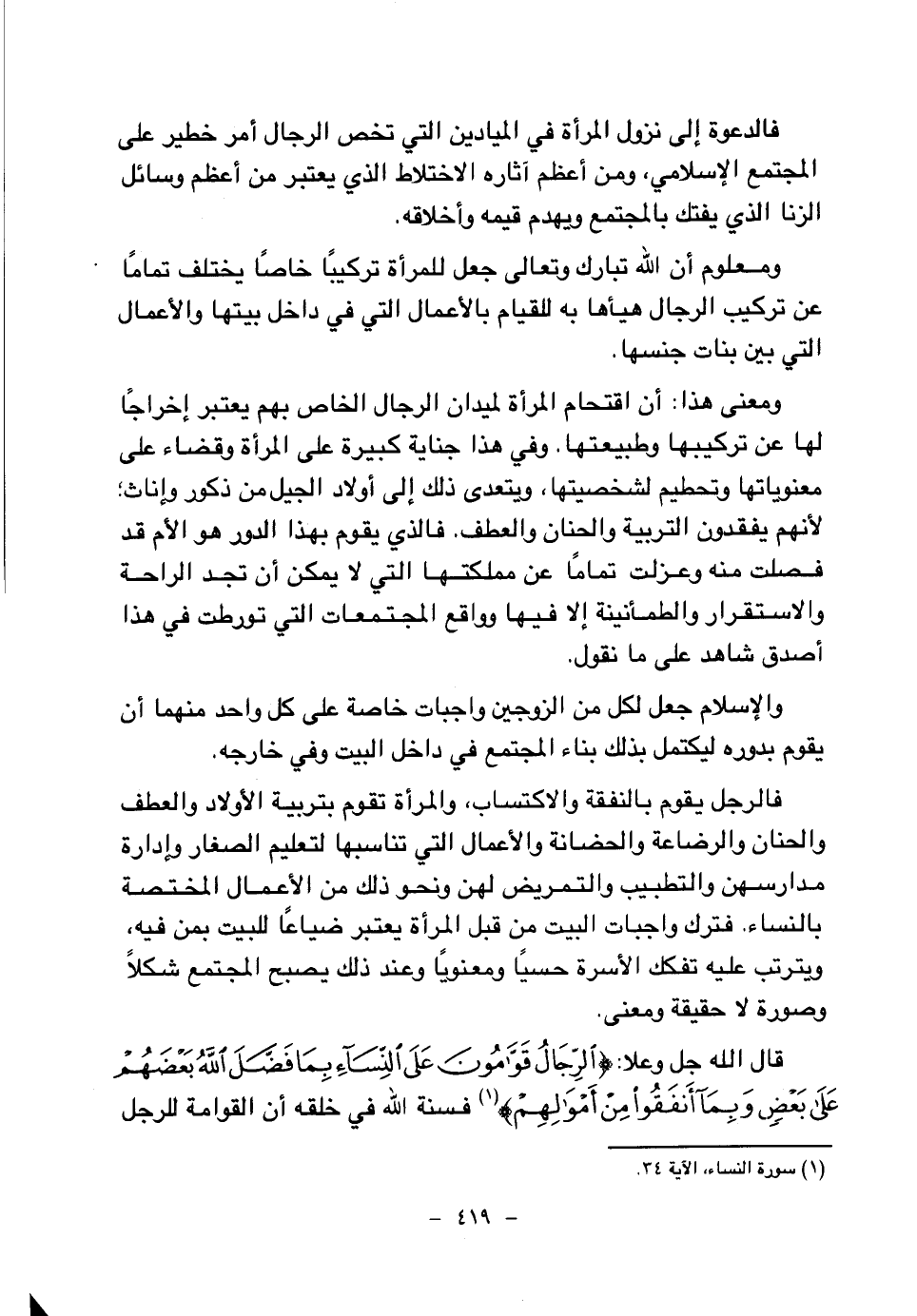 فالرجل يقوم بالنفقة والاكتساب، والمرأة تقوم بتربية الأولاد والعطف والحنان والرضاعة والحضانة والأعمال التي تناسبها لتعليم الصغار وإدارة مدارسهن والتطبيب والتمريض لهن ونحو ذلك من الأعمال المختصة بالنساء. فترك واجبات البيت من قبل المرأة يعتبر ضياعا للبيت بمن فيه، ويترتب عليه تفكك الأسرة حسيا ومعنويا وعند ذلك يصبح المجتمع شكلا وصورة لا حقيقة ومعنى.