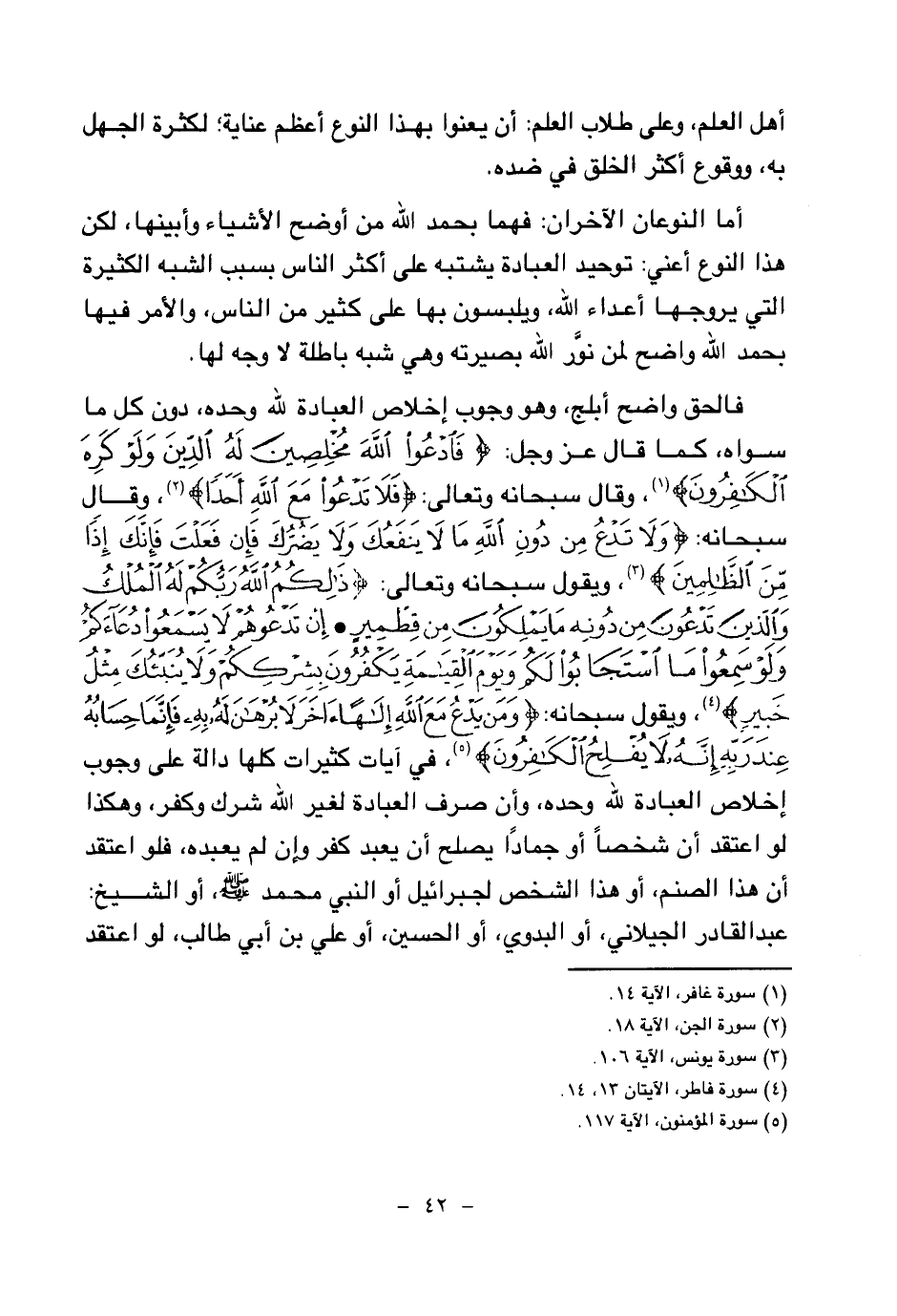 فالحق واضح أبلج، وهو وجوب إخلاص العبادة لله وحده، دون كل ما سواه، كما قال عز وجل: {فَادْعُوا اللَّهَ مُخْلِصِينَ لَهُ الدِّينَ وَلَوْ كَرِهَ الْكَافِرُونَ} (¬1) وقال سبحانه وتعالى: {فَلَا تَدْعُوا مَعَ اللَّهِ أَحَدًا} (¬2) وقال سبحانه: {وَلَا تَدْعُ مِنْ دُونِ اللَّهِ مَا لَا يَنْفَعُكَ وَلَا يَضُرُّكَ فَإِنْ فَعَلْتَ فَإِنَّكَ إِذًا مِنَ الظَّالِمِينَ} (¬3) ويقول سبحانه وتعالى: {ذَلِكُمُ اللَّهُ رَبُّكُمْ لَهُ الْمُلْكُ وَالَّذِينَ تَدْعُونَ مِنْ دُونِهِ مَا يَمْلِكُونَ مِنْ قِطْمِيرٍ} (¬4) {إِنْ تَدْعُوهُمْ لَا يَسْمَعُوا دُعَاءَكُمْ وَلَوْ سَمِعُوا مَا اسْتَجَابُوا لَكُمْ وَيَوْمَ الْقِيَامَةِ يَكْفُرُونَ بِشِرْكِكُمْ وَلَا يُنَبِّئُكَ مِثْلُ خَبِيرٍ} (¬5) ويقول سبحانه: {وَمَنْ يَدْعُ مَعَ اللَّهِ إِلَهًا آخَرَ لَا بُرْهَانَ لَهُ بِهِ فَإِنَّمَا حِسَابُهُ عِنْدَ رَبِّهِ إِنَّهُ لَا يُفْلِحُ الْكَافِرُونَ} (¬6) في آيات كثيرات كلها دالة على وجوب إخلاص العبادة لله وحده، وأن صرف العبادة لغير الله شرك وكفر، وهكذا لو اعتقد أن شخصا أو جمادا يصلح أن يعبد كفر وإن لم يعبده، فلو اعتقد أن هذا الصنم، أو هذا الشخص لجبرائيل أو النبي محمد صلى الله عليه وسلم، أو الشيخ: عبد القادر الجيلاني، أو البدوي، أو الحسين، أو علي بن أبي طالب، لو اعتقد