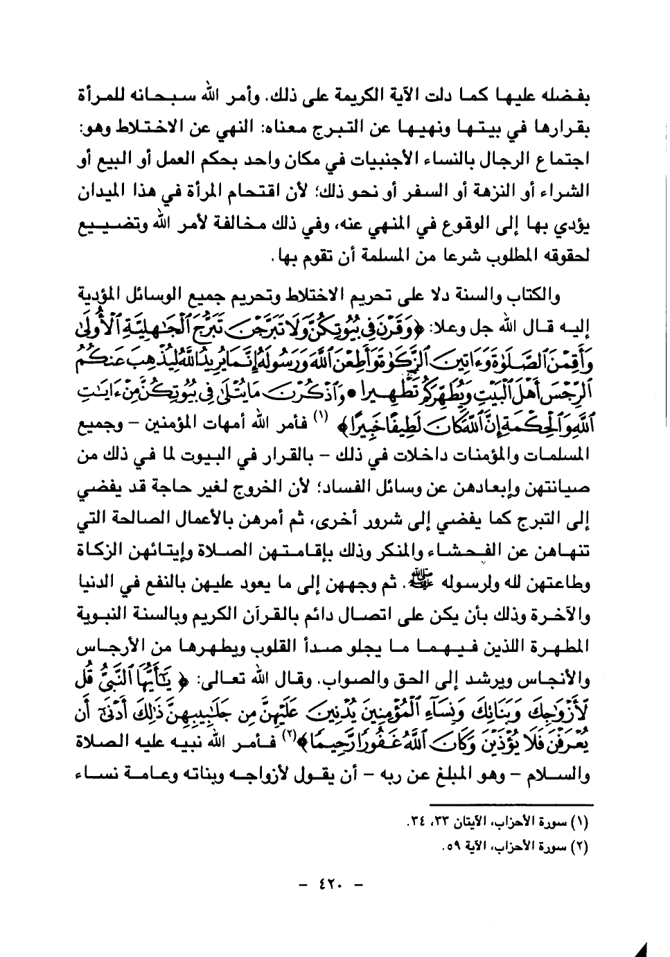والكتاب والسنة دلا على تحريم الاختلاط وتحريم جميع الوسائل المؤدية إليه قال الله جل وعلا: {وَقَرْنَ فِي بُيُوتِكُنَّ وَلَا تَبَرَّجْنَ تَبَرُّجَ الْجَاهِلِيَّةِ الْأُولَى وَأَقِمْنَ الصَّلَاةَ وآتِينَ الزَّكَاةَ وَأَطِعْنَ اللَّهَ وَرَسُولَهُ إِنَّمَا يُرِيدُ اللَّهُ لِيُذْهِبَ عَنْكُمُ الرِّجْسَ أَهْلَ الْبَيْتِ وَيُطَهِّرَكُمْ تَطْهِيرًا} (¬1) {وَاذْكُرْنَ مَا يُتْلَى فِي بُيُوتِكُنَّ مِنْ آيَاتِ اللَّهِ وَالْحِكْمَةِ إِنَّ اللَّهَ كَانَ لَطِيفًا خَبِيرًا} (¬2) فأمر الله أمهات المؤمنين- وجميع المسلمات والمؤمنات داخلات في ذلك- بالقرار في البيوت لما في ذلك من صيانتهن وإبعادهن عن وسائل الفساد؛ لأن الخروج لغير حاجة قد يفضي إلى التبرج كما يفضي إلى شرور أخرى، ثم أمرهن بالأعمال الصالحة التي تنهاهن عن الفحشاء والمنكر وذلك بإقامتهن الصلاة وإيتائهن الزكاة وطاعتهن لله ولرسوله صلى الله عليه وسلم، ثم وجههن إلى ما يعود عليهن بالنفع في الدنيا والآخرة وذلك بأن يكن على اتصال دائم بالقرآن الكريم وبالسنة النبوية المطهرة اللذين فيهما ما يجلو صدأ القلوب ويطهرها من الأرجاس والأنجاس ويرشد إلى الحق والصواب، وقال الله تعالى: {يَا أَيُّهَا النَّبِيُّ قُلْ لِأَزْوَاجِكَ وَبَنَاتِكَ وَنِسَاءِ الْمُؤْمِنِينَ يُدْنِينَ عَلَيْهِنَّ مِنْ جَلَابِيبِهِنَّ ذَلِكَ أَدْنَى أَنْ يُعْرَفْنَ فَلَا يُؤْذَيْنَ وَكَانَ اللَّهُ غَفُورًا رَحِيمًا} (¬3) فأمر الله نبيه عليه الصلاة والسلام- وهو المبلغ عن ربه- أن يقول لأزواجه وبناته وعامة نساء
