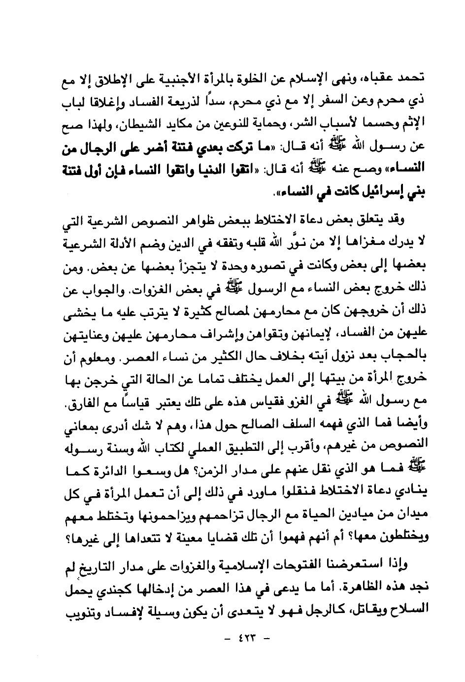 وقد يتعلق بعض دعاة الاختلاط ببعض ظواهر النصوص الشرعية التي لا يدرك مغزاها إلا من نور الله قلبه وتفقه في الدين وضم الأدلة الشرعية بعضها إلى بعض وكانت في تصوره وحدة لا يتجزأ بعضها عن بعض، ومن ذلك خروج بعض النساء مع الرسول صلى الله عليه وسلم في بعض الغزوات، والجواب عن ذلك أن خروجهن كان مع محارمهن لمصالح كثيرة لا يترتب عليه ما يخشى عليهن من الفساد، لإيمانهن وتقواهن وإشراف محارمهن عليهن وعنايتهن بالحجاب بعد نزول آيته بخلاف حال الكثير من نساء العصر، ومعلوم أن خروج المرأة من بيتها إلى العمل يختلف تماما عن الحالة التي خرجن بها مع رسول الله صلى الله عليه وسلم في الغزو فقياس هذه على تلك يعتبر قياسا مع الفارق. وأيضا فما الذي فهمه السلف الصالح حول هذا، وهم لا شك أدرى بمعاني النصوص من غيرهم، وأقرب إلى التطبيق العملي لكتاب الله وسنة رسوله صلى الله عليه وسلم فما هو الذي نقل عنهم على مدار الزمن؟ هل وسعوا الدائرة كما ينادي دعاة الاختلاط فنقلوا ما ورد في ذلك إلى أن تعمل المرأة في كل ميدان من ميادين الحياة مع الرجال تزاحمهم ويزاحمونها وتختلط معهم ويختلطون معها؟ أم أنهم فهموا أن تلك قضايا معينة لا تتعداها إلى غيرها؟