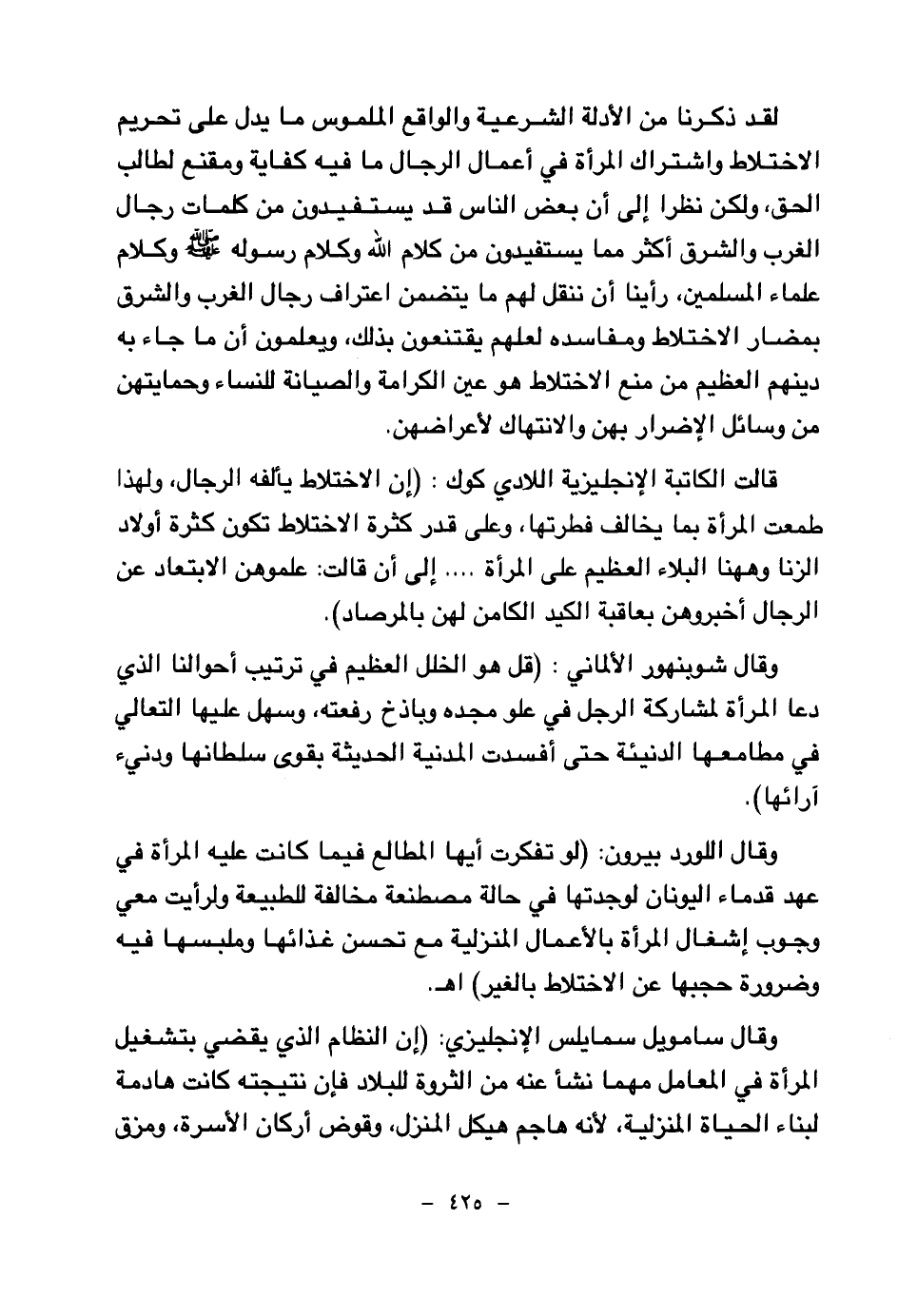وقال اللورد بيرون: (لو تفكرت أيها المطالع فيما كانت عليه المرأة في عهد قدماء اليونان لوجدتها في حالة مصطنعة مخالفة للطبيعة ولرأيت معي وجوب إشغال المرأة بالأعمال المنزلية مع تحسن غذائها وملبسها فيه وضرورة حجبها عن الاختلاط بالغير) اهـ.