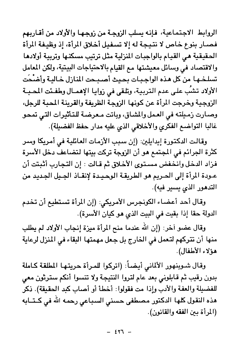 وقال عضو آخر: (إن الله عندما منح المرأة ميزة إنجاب الأولاد لم يطلب منها أن تتركهم لتعمل في الخارج بل جعل مهمتها البقاء في المنزل لرعاية هؤلاء الأطفال) .