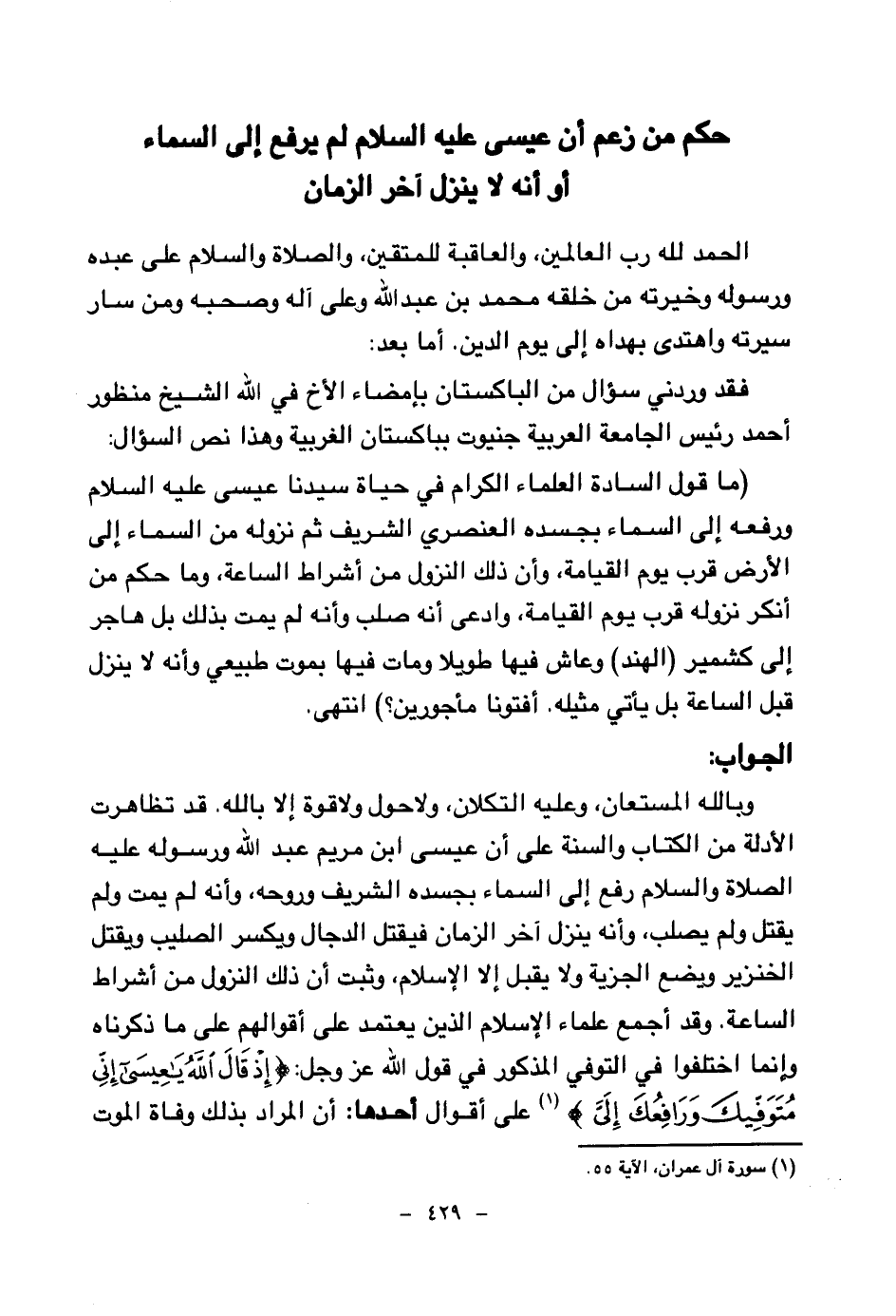 الجواب: وبالله المستعان، وعليه التكلان، ولا حول ولا قوة إلا بالله، قد تظاهرت الأدلة من الكتاب والسنة على أن عيسى ابن مريم عبد الله ورسوله عليه الصلاة والسلام رفع إلى السماء بجسده الشريف وروحه، وأنه لم يمت ولم يقتل ولم يصلب، وأنه ينزل آخر الزمان فيقتل الدجال ويكسر الصليب ويقتل الخنزير ويضع الجزية ولا يقبل إلا الإسلام، وثبت أن ذلك النزول من أشراط الساعة. وقد أجمع علماء الإسلام الذين يعتمد على أقوالهم على ما ذكرناه وإنما اختلفوا في التوفي المذكور في قول الله عز وجل: {إِذْ قَالَ اللَّهُ يَا عِيسَى إِنِّي مُتَوَفِّيكَ وَرَافِعُكَ إِلَيَّ} (¬1) على أقوال أحدهما: أن المراد بذلك وفاة الموت