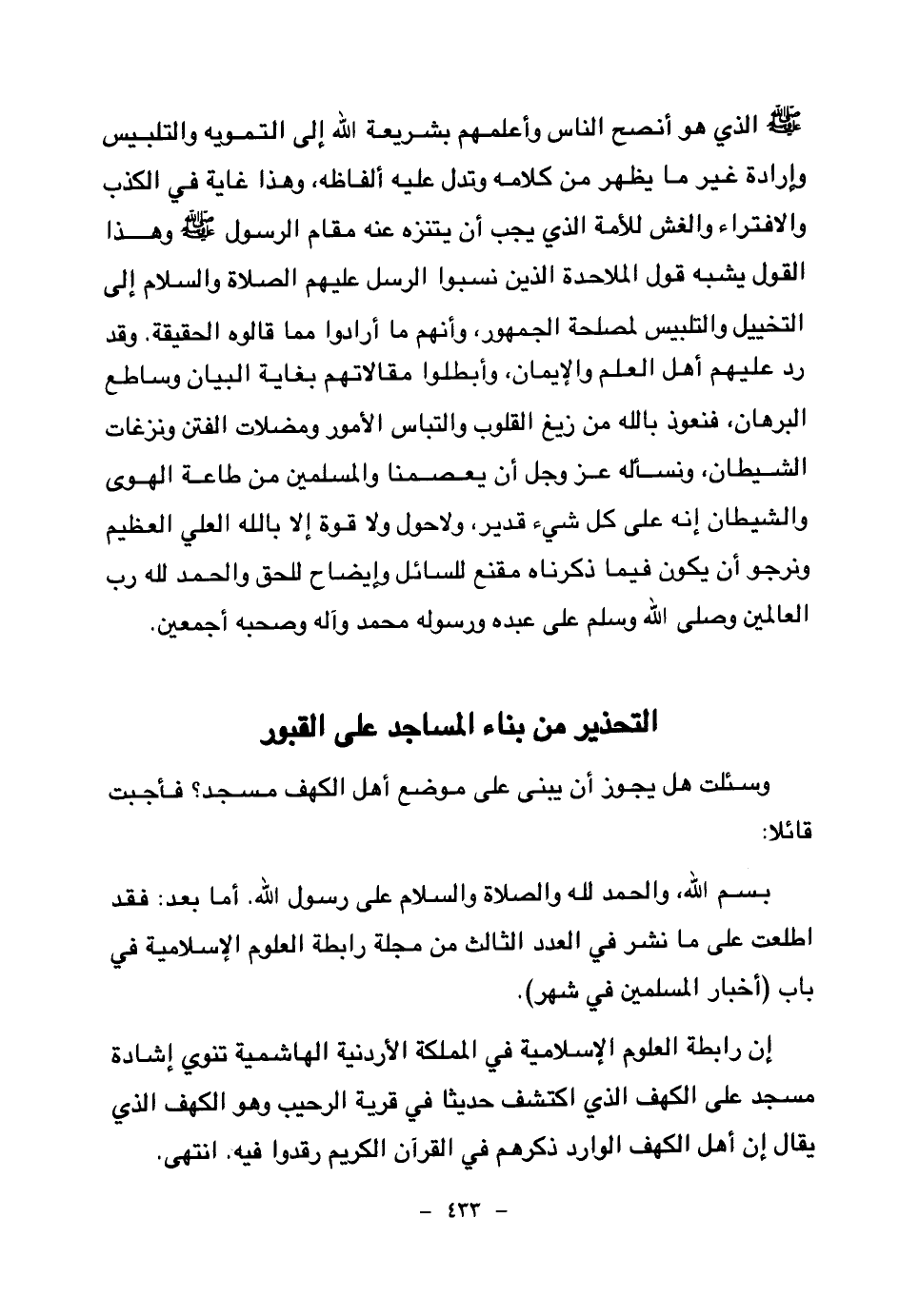 صلى الله عليه وسلم الذي هو أنصح الناس وأعلمهم بشريعة الله إلى التمويه والتلبيس وإرادة غير ما يظهر من كلامه وتدل عليه ألفاظه، وهذا غاية في الكذب والافتراء والغش للأمة الذي يجب أن يتنزه عنه مقام الرسول صلى الله عليه وسلم وهذا القول يشبه قول الملاحدة الذين نسبوا الرسل عليهم الصلاة والسلام إلى التخييل والتلبيس لمصلحة الجمهور، وأنهم ما أرادوا مما قالوه الحقيقة. وقد رد عليهم أهل العلم والإيمان، وأبطلوا مقالاتهم بغاية البيان وساطع البرهان، فنعوذ بالله من زيغ القلوب والتباس الأمور ومضلات الفتن ونزغات الشيطان، ونسأله عز وجل أن يعصمنا والمسلمين من طاعة الهوى والشيطان إنه على كل شيء قدير، ولا حول ولا قوة إلا بالله العلي العظيم ونرجو أن يكون فيما ذكرناه مقنع للسائل وإيضاح للحق والحمد لله رب العالمين وصلى الله وسلم على عبده ورسوله محمد وآله وصحبه أجمعين.