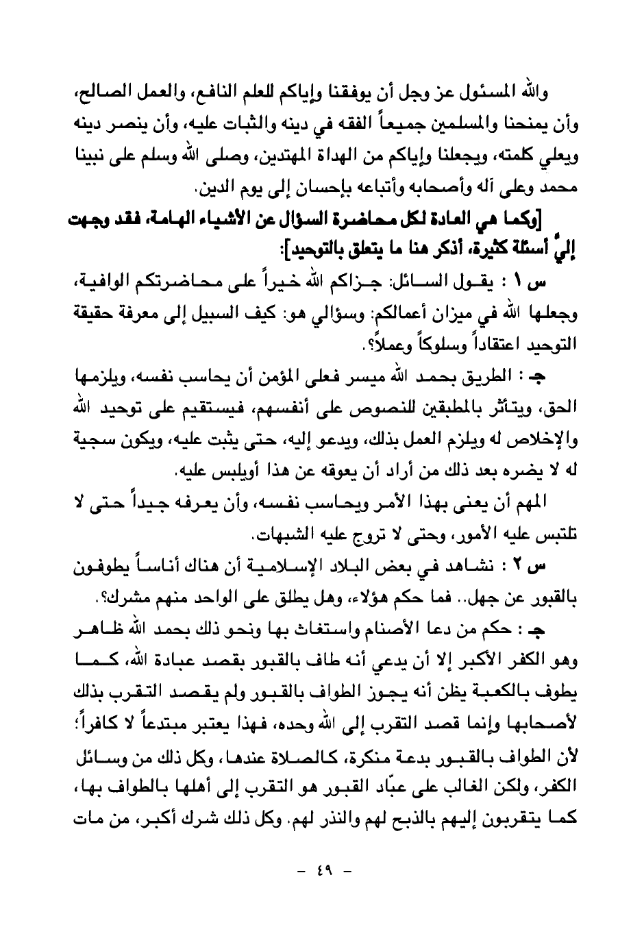 [وكما هي العادة لكل محاضرة السؤال عن الأشياء الهامة فقد وجهت إلي أسئلة كثيرة، أذكر هنا ما يتعلق بالتوحيد] :