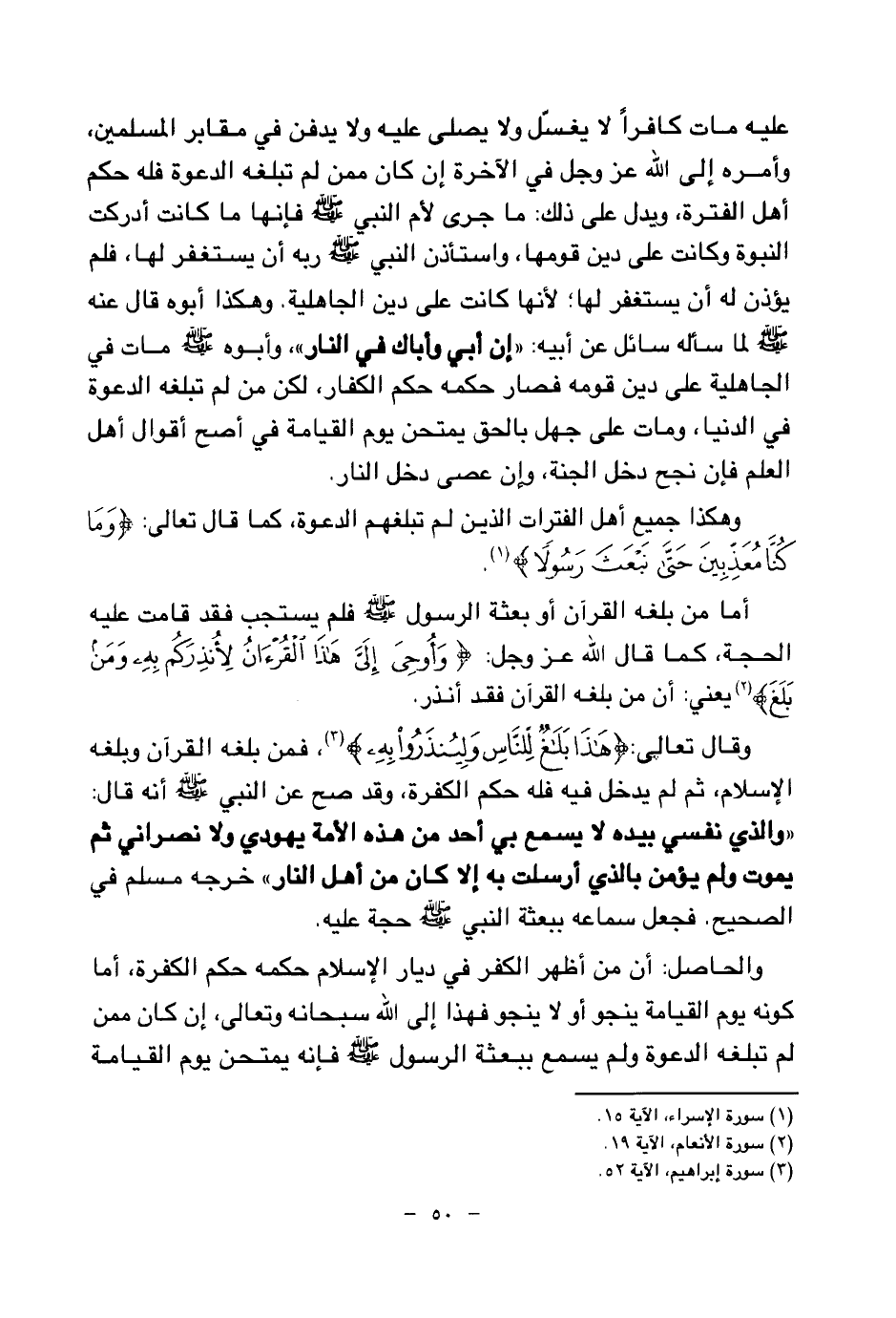 أما من بلغه القرآن أو بعثة الرسول صلى الله عليه وسلم فلم يستجب فقد قامت عليه الحجة، كما قال الله عز وجل: {وَأُوحِيَ إِلَيَّ هَذَا الْقُرْآنُ لِأُنْذِرَكُمْ بِهِ وَمَنْ بَلَغَ} (¬3) يعني: أن من بلغه القرآن فقد أنذر.