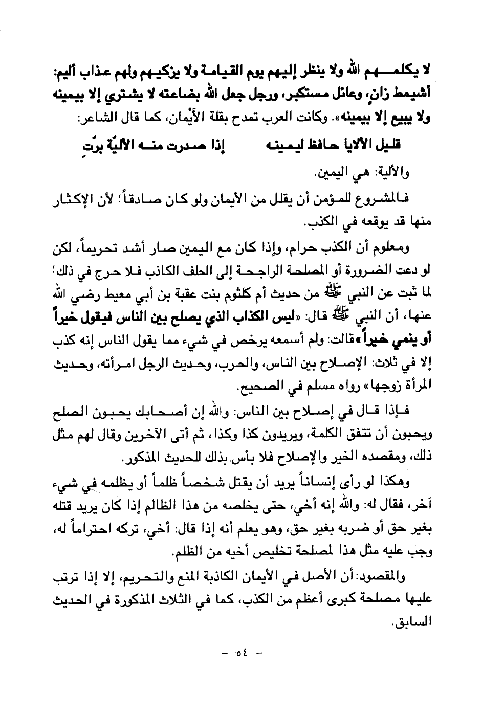 ومعلوم أن الكذب حرام، وإذا كان مع اليمين صار أشد تحريما، لكن لو دعت الضرورة أو المصلحة الراجحة إلى الحلف الكاذب فلا حرج في ذلك؛ لما ثبت عن النبي صلى الله عليه وسلم من حديث أم كلثوم بنت عقبة بن أبي معيط رضي الله عنها، أن النبي صلى الله عليه وسلم قال: «ليس الكذاب الذي يصلح بين الناس فيقول خيرا أو ينمي خيرا قالت: ولم أسمعه يرخص في شيء مما يقول الناس إنه كذب إلا في ثلاث: الإصلاح بين الناس، والحرب، وحديث الرجل امرأته، وحديث المرأة زوجها (¬1) » رواه مسلم في الصحيح.