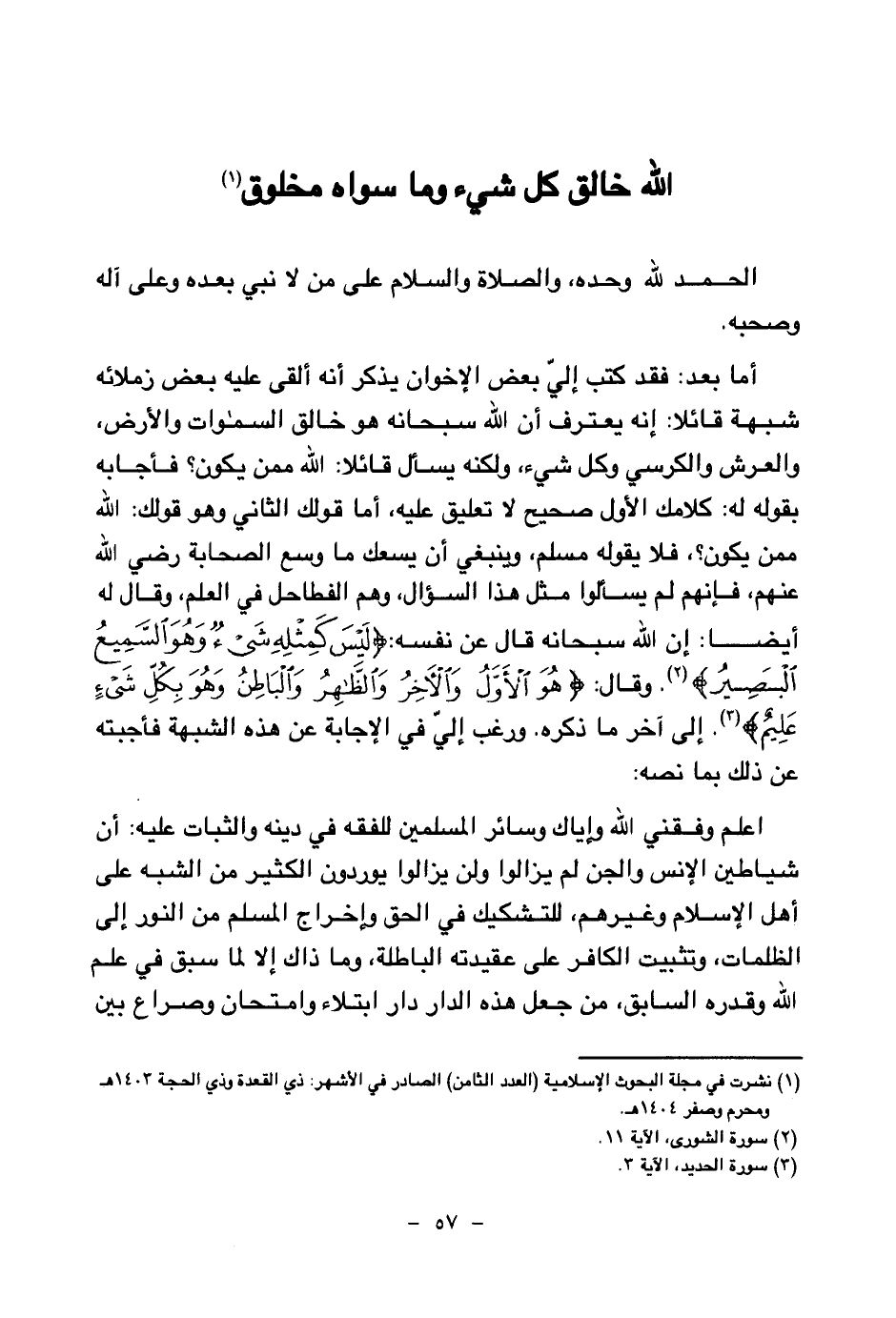 أما بعد: فقد كتب إلي بعض الإخوان يذكر أنه ألقى عليه بعض زملائه شبهة قائلا: إنه يعترف أن الله سبحانه هو خالق السماوات والأرض، والعرش والكرسي وكل شيء، ولكنه يسأل قائلا: الله ممن يكون؟ فأجابه بقوله له: كلامك الأول صحيح لا تعليق عليه، أما قولك الثاني وهو قولك: الله ممن يكون؟ فلا يقوله مسلم، وينبغي أن يسعك ما وسع الصحابة رضي الله عنهم، فإنهم لم يسألوا مثل هذا السؤال، وهم الفطاحل في العلم، وقال له أيضا: إن الله سبحانه قال عن نفسه: {لَيْسَ كَمِثْلِهِ شَيْءٌ وَهُوَ السَّمِيعُ الْبَصِيرُ} (¬1) وقال: {هُوَ الْأَوَّلُ وَالْآخِرُ وَالظَّاهِرُ وَالْبَاطِنُ وَهُوَ بِكُلِّ شَيْءٍ عَلِيمٌ} (¬2) إلى آخر ما ذكره. ورغب إلي في الإجابة عن هذه الشبهة فأجبته عن ذلك بما نصه: