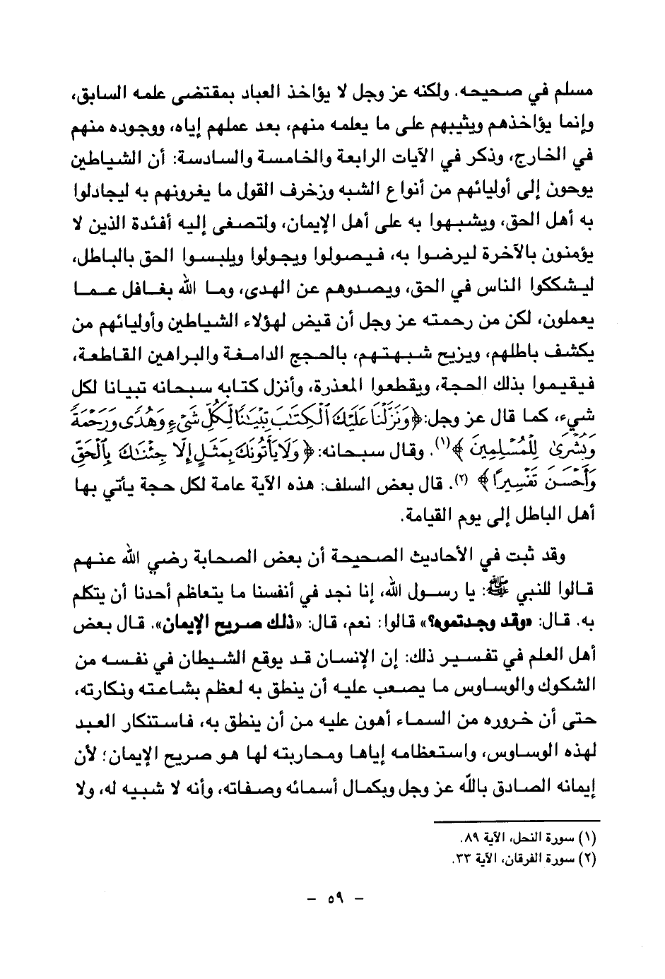 وقد ثبت في الأحاديث الصحيحة أن بعض الصحابة رضي الله عنهم قالوا للنبي صلى الله عليه وسلم: «يا رسول الله، إنا نجد في أنفسنا ما يتعاظم أحدنا أن يتكلم به قال: وقد وجدتموه؟ قالوا: نعم. قال: ذلك صريح الإيمان (¬3) » . قال بعض أهل العلم في تفسير ذلك: إن الإنسان قد يوقع الشيطان في نفسه من الشكوك والوساوس ما يصعب عليه أن ينطق به لعظم بشاعته ونكارته، حتى إن خروره من السماء أهون عليه من أن ينطق به، فاستنكار العبد لهذه الوساوس، واستعظامه إياها ومحاربته لها هو صريح الإيمان؛ لأن إيمانه الصادق بالله عز وجل وبكمال أسمائه وصفاته، وأنه لا شبيه له، ولا