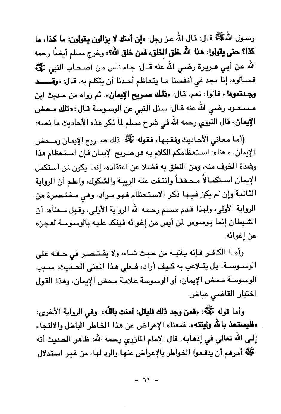 قال النووي رحمه الله في شرح مسلم لما ذكر هذه الأحاديث ما نصه: (أما معاني الأحاديث وفقهها، فقوله صلى الله عليه وسلم: «ذلك صريح الإيمان ومحض الإيمان (¬4) » ، معناه: استعظامكم الكلام به هو صريح الإيمان فإن استعظام هذا وشدة الخوف منه، ومن النطق به فضلا عن اعتقاده، إنما يكون لمن استكمل الإيمان استكمالا محققا وانتفت عنه الريبة والشكوك، واعلم أن الرواية الثانية وإن لم يكن فيها ذكر الاستعظام فهو مراد، وهي مختصرة من الرواية الأولى، ولهذا قدم مسلم رحمه الله الرواية الأولى، وقيل: معناه أن الشيطان إنما يوسوس لمن أيس من إغوائه فينكد عليه بالوسوسة لعجزه عن إغوائه.