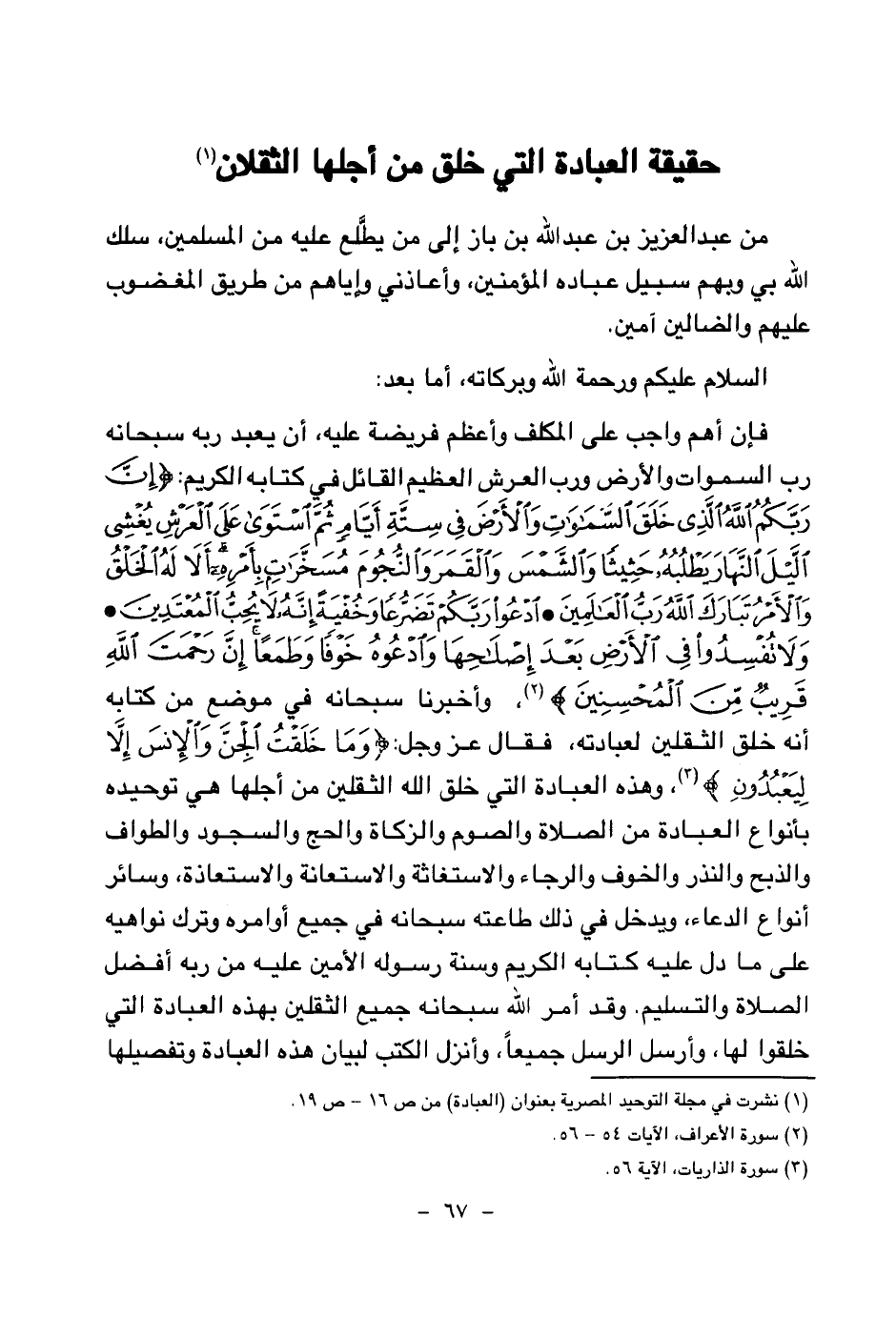 من عبد العزيز بن عبد الله بن باز إلى من يطلع عليه من المسلمين، سلك الله بي وبهم سبيل عباده المؤمنين، وأعاذني وإياهم من طريق المغضوب عليهم والضالين آمين. السلام عليكم ورحمة الله وبركاته، أما بعد: فإن أهم واجب على المكلف وأعظم فريضة عليه، أن يعبد ربه سبحانه رب السماوات والأرض ورب العرش العظيم القائل في كتابه الكريم: