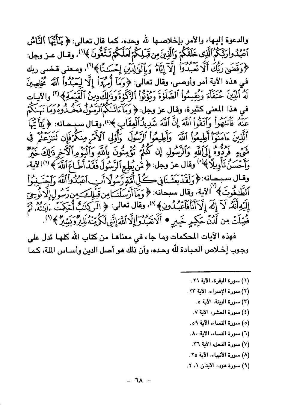 فهذه الآيات المحكمات وما جاء في معناها من كتاب الله كلها تدل على وجوب إخلاص العبادة لله وحده، وأن ذلك هو أصل الدين وأساس الملة، كما