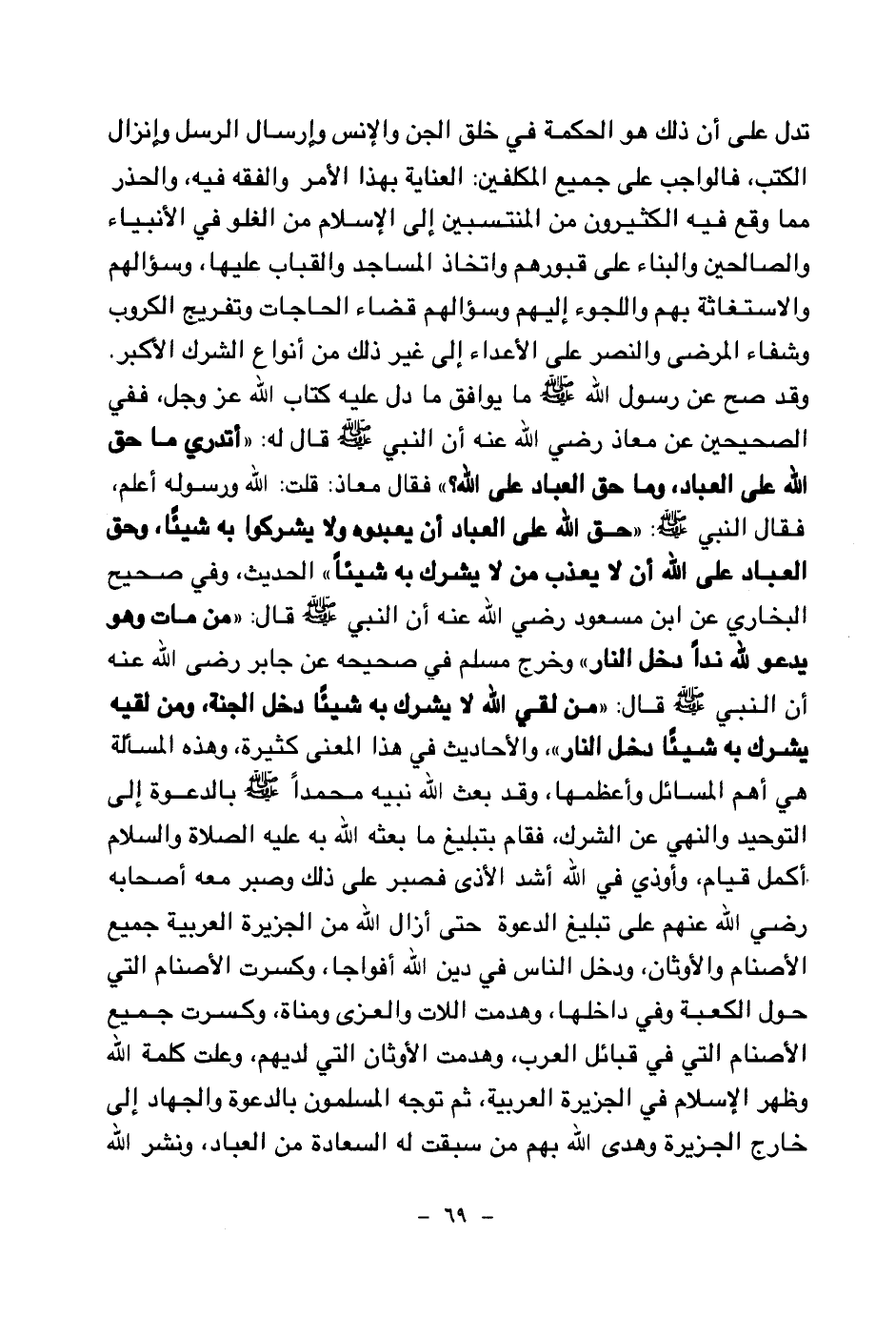تدل على أن ذلك هو الحكمة في خلق الجن والإنس وإرسال الرسل وإنزال الكتب، فالواجب على جميع المكلفين: العناية بهذا الأمر والفقه فيه، والحذر مما وقع فيه الكثيرون من المنتسبين إلى الإسلام من الغلو في الأنبياء والصالحين والبناء على قبورهم واتخاذ المساجد والقباب عليها، وسؤالهم والاستغاثة بهم واللجوء إليهم وسؤالهم قضاء الحاجات وتفريج الكروب وشفاء المرضى والنصر على الأعداء إلى غير ذلك من أنواع الشرك الأكبر.