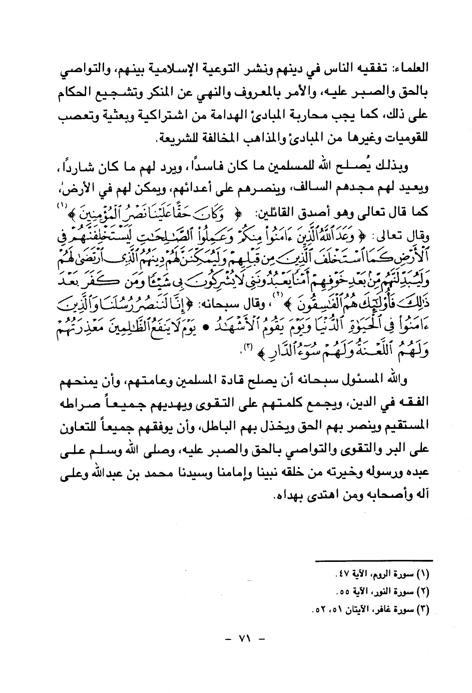 العلماء: تفقيه الناس في دينهم ونشر التوعية الإسلامية بينهم، والتواصي بالحق والصبر عليه، والأمر بالمعروف والنهي عن المنكر وتشجيع الحكام على ذلك، كما يجب محاربة المبادئ الهدامة من اشتراكية وبعثية وتعصب للقوميات وغيرها من المبادئ والمذاهب المخالفة للشريعة.