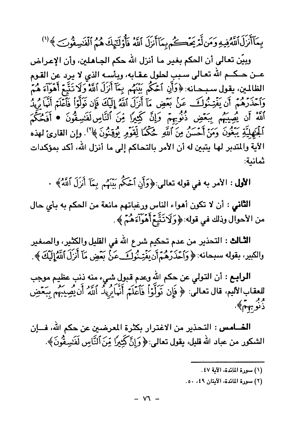 الثالث: التحذير من عدم تحكيم شرع الله في القليل والكثير، والصغير والكبير، بقوله سبحانه: {وَاحْذَرْهُمْ أَنْ يَفْتِنُوكَ عَنْ بَعْضِ مَا أَنْزَلَ اللَّهُ إِلَيْكَ} (¬5)