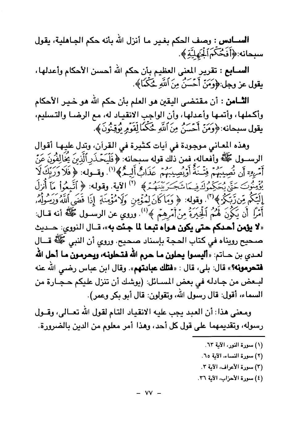 وهذه المعاني موجودة في آيات كثيرة في القرآن، وتدل عليها أقوال الرسول صلى الله عليه وسلم وأفعاله، فمن ذلك قوله سبحانه: {فَلْيَحْذَرِ الَّذِينَ يُخَالِفُونَ عَنْ أَمْرِهِ أَنْ تُصِيبَهُمْ فِتْنَةٌ أَوْ يُصِيبَهُمْ عَذَابٌ أَلِيمٌ} (¬4) وقوله: {فَلَا وَرَبِّكَ لَا يُؤْمِنُونَ حَتَّى يُحَكِّمُوكَ فِيمَا شَجَرَ بَيْنَهُمْ} (¬5) الآية، وقوله: {اتَّبِعُوا مَا أُنْزِلَ إِلَيْكُمْ مِنْ رَبِّكُمْ} (¬6) وقوله: {وَمَا كَانَ لِمُؤْمِنٍ وَلَا مُؤْمِنَةٍ إِذَا قَضَى اللَّهُ وَرَسُولُهُ أَمْرًا أَنْ يَكُونَ لَهُمُ الْخِيَرَةُ مِنْ أَمْرِهِمْ} (¬7)