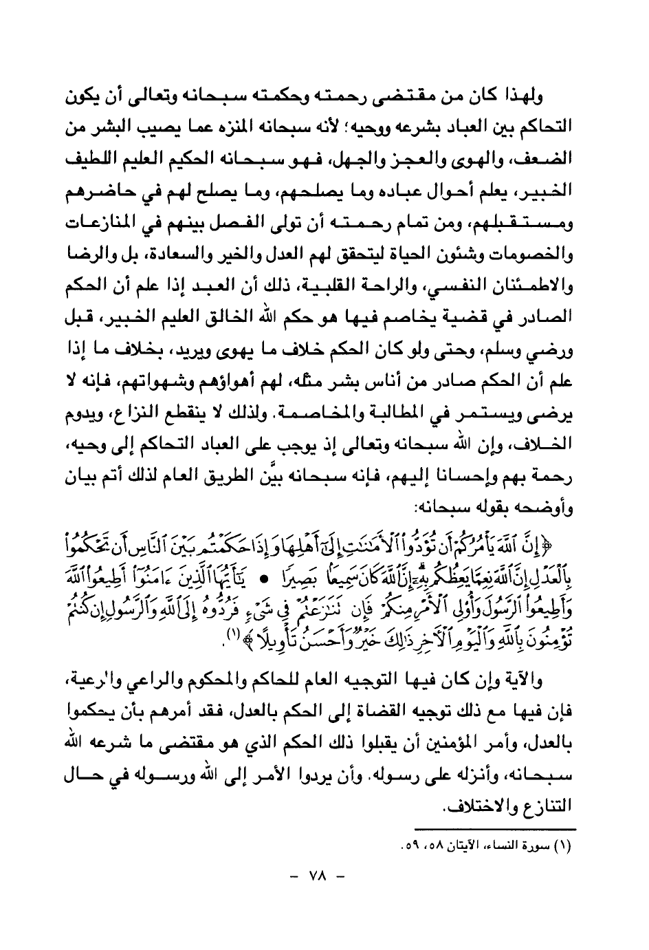 {إِنَّ اللَّهَ يَأْمُرُكُمْ أَنْ تُؤَدُّوا الْأَمَانَاتِ إِلَى أَهْلِهَا وَإِذَا حَكَمْتُمْ بَيْنَ النَّاسِ أَنْ تَحْكُمُوا بِالْعَدْلِ إِنَّ اللَّهَ نِعِمَّا يَعِظُكُمْ بِهِ إِنَّ اللَّهَ كَانَ سَمِيعًا بَصِيرًا} (¬1) {يَا أَيُّهَا الَّذِينَ آمَنُوا أَطِيعُوا اللَّهَ وَأَطِيعُوا الرَّسُولَ وَأُولِي الْأَمْرِ مِنْكُمْ فَإِنْ تَنَازَعْتُمْ فِي شَيْءٍ فَرُدُّوهُ إِلَى اللَّهِ وَالرَّسُولِ إِنْ كُنْتُمْ تُؤْمِنُونَ بِاللَّهِ وَالْيَوْمِ الْآخِرِ ذَلِكَ خَيْرٌ وَأَحْسَنُ تَأْوِيلًا} (¬2)