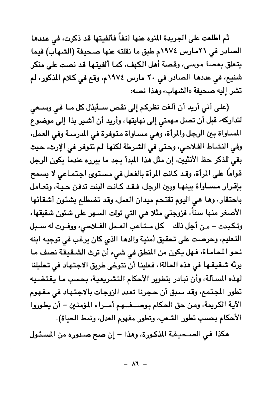 (على أني أريد أن ألفت نظركم إلى نقص سأبذل كل ما في وسعي لتداركه، قبل أن تصل مهمتي إلى نهايتها، وأريد أن أشير بذا إلى موضوع المساواة بين الرجل والمرأة، وهي مساواة متوفرة في المدرسة وفي العمل، وفي النشاط الفلاحي، وحتى في الشرطة لكنها لم تتوفر في الإرث، حيث بقي للذكر حظ الأنثيين، إن مثل هذا المبدأ يجد ما يبرره عندما يكون الرجل قواما على المرأة، وقد كانت المرأة بالفعل في مستوى اجتماعي لا يسمح بإقرار مساواة بينها وبين الرجل، فقد كانت البنت تدفن حية، وتعامل باحتقار، وها هي اليوم تقتحم ميدان العمل، وقد تضطلع بشئون أشقائها الأصغر منها سنا، فزوجتي مثلا هي التي تولت السهر على شئون شقيقها، وتكبدت - من أجل ذلك - كل متاعب العمل الفلاحي، ووفرت له سبل التعليم، وحرصت على تحقيق أمنية والدها الذي كان يرغب في توجيه ابنه نحو المحاماة، فهل يكون من المنطق في شيء أن ترث الشقيقة نصف ما يرثه شقيقها في هذه الحالة! فعلينا أن نتوخى طريق الاجتهاد في تحليلنا لهذه المسألة، وأن نبادر بتطوير الأحكام التشريعية، بحسب ما يقتضيه تطور المجتمع، وقد سبق أن حجرنا تعدد الزوجات بالاجتهاد في مفهوم الآية الكريمة، ومن حق الحكام بوصفهم أمراء المؤمنين - أن يطوروا الأحكام بحسب تطور الشعب، وتطور مفهوم العدل، ونمط الحياة) .