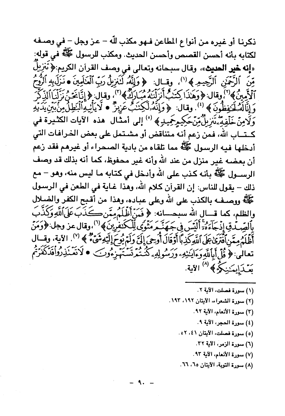 ذكرنا أو غيره من أنواع المطاعن فهو مكذب لله - عز وجل - في وصفه لكتابه بأنه أحسن القصص وأحسن الحديث، ومكذب للرسول صلى الله عليه وسلم في قوله: إنه خير الحديث، وقال سبحانه وتعالى في وصف القرآن الكريم: {تَنْزِيلٌ مِنَ الرَّحْمَنِ الرَّحِيمِ} (¬1) وقال: {وَإِنَّهُ لَتَنْزِيلُ رَبِّ الْعَالَمِينَ} (¬2) {نَزَلَ بِهِ الرُّوحُ الْأَمِينُ} (¬3) وقال {وَهَذَا كِتَابٌ أَنْزَلْنَاهُ مُبَارَكٌ} (¬4) وقال: {إِنَّا نَحْنُ نَزَّلْنَا الذِّكْرَ وَإِنَّا لَهُ لَحَافِظُونَ} (¬5) وقال: {وَإِنَّهُ لَكِتَابٌ عَزِيزٌ} (¬6) {لَا يَأْتِيهِ الْبَاطِلُ مِنْ بَيْنِ يَدَيْهِ وَلَا مِنْ خَلْفِهِ تَنْزِيلٌ مِنْ حَكِيمٍ حَمِيدٍ} (¬7) إلى أمثال هذه الآيات الكثيرة في كتاب الله، فمن زعم أنه متناقض أو مشتمل على بعض الخرافات التي أدخلها فيه الرسول صلى الله عليه وسلم مما تلقاه من بادية الصحراء أو غيرهم فقد زعم أن بعضه غير منزل من عند الله وأنه غير محفوظ، كما أنه بذلك قد وصف الرسول صلى الله عليه وسلم بأنه كذب على الله وأدخل في كتابه ما ليس منه، وهو - مع ذلك - يقول للناس: إن القرآن كلام الله، وهذا غاية في الطعن في الرسول صلى الله عليه وسلم ووصفه بالكذب على الله وعلى عباده، وهذا من أقبح الكفر والضلال والظلم، كما قال الله سبحانه: {فَمَنْ أَظْلَمُ مِمَّنْ كَذَبَ عَلَى اللَّهِ وَكَذَّبَ بِالصِّدْقِ إِذْ جَاءَهُ أَلَيْسَ فِي جَهَنَّمَ مَثْوًى لِلْكَافِرِينَ} (¬8) وقال عز وجل: {وَمَنْ أَظْلَمُ مِمَّنِ افْتَرَى عَلَى اللَّهِ كَذِبًا أَوْ قَالَ أُوحِيَ إِلَيَّ وَلَمْ يُوحَ إِلَيْهِ شَيْءٌ} (¬9) الآية، وقال تعالى: {قُلْ أَبِاللَّهِ وَآيَاتِهِ وَرَسُولِهِ كُنْتُمْ تَسْتَهْزِئُونَ} (¬10) {لَا تَعْتَذِرُوا قَدْ كَفَرْتُمْ بَعْدَ إِيمَانِكُمْ} (¬11) الآية.
