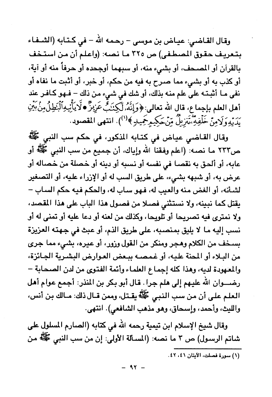 وقال القاضي عياض في كتابه المذكور، في حكم سب النبي صلى الله عليه وسلم ص 233 ما نصه: (اعلم وفقنا الله وإياك، أن جميع من سب النبي صلى الله عليه وسلم أو عابه، أو ألحق به نقصا في نفسه أو نسبه أو دينه أو خصلة من خصاله أو عرض به، أو شبهه بشيء، على طريق السب له أو الإزراء عليه، أو التصغير لشأنه، أو الغض منه والعيب له، فهو ساب له، والحكم فيه حكم الساب - يقتل كما نبينه، ولا نستثني فصلا من فصول هذا الباب على هذا المقصد، ولا نمتري فيه تصريحا أو تلويحا، وكذلك من لعنه أو دعا عليه أو تمنى له أو نسب إليه ما لا يليق بمنصبه، على طريق الذم، أو عبث في جهته العزيزة بسخف من الكلام وهجر ومنكر من القول وزور، أو عيره بشيء مما جرى من البلاء أو المحنة عليه، أو غمصه ببعض العوارض البشرية الجائزة، والمعهودة لديه، وهذا كله إجماع العلماء وأئمة الفتوى من لدن الصحابة - رضوان الله عليهم إلى هلم جرا.