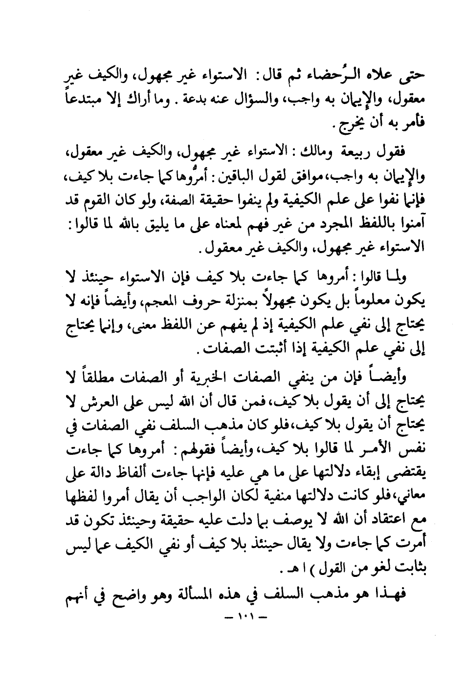 وأيضا فإن من ينفي الصفات الخبرية أو الصفات مطلقا لا يحتاج إلى أن يقول بلا كيف، فمن قال أن الله ليس على العرش لا يحتاج أن يقول بلا كيف، فلو كان مذهب السلف نفي الصفات في نفس الأمر لما قالوا بلا كيف، وأيضا فقولهم: أمروها كما جاءت يقتضي إبقاء دلالتها على ما هي عليه فإنها جاءت ألفاظ دالة على معاني، فلو كانت دلالتها منفية لكان الواجب أن يقال أمروا لفظها مع اعتقاد أن الله لا يوصف بما دلت عليه حقيقة وحيئئذ تكون قد أمرت كما جاءت ولا يقال حينئذ بلا كيف أو نفي الكيف عما ليس بثابت لغو من القول) اهـ.
