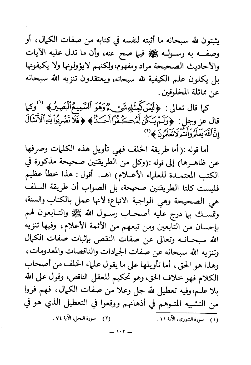 يثبتون لله سبحانه ما أثبته لنفسه في كتابه من صفات الكمال، أو وصفه به رسوله صلى الله عليه وسلم فيما صح عنه، وأن ما تدل عليه الآيات والأحاديث الصحيحة مراد ومفهوم، ولكنهم لا يؤولونها ولا يكيفونها بل يكلون علم الكيفية لله سبحانه، ويعتقدون تنزيه الله سبحانه عن مماثلة المخلوقين. كما قال تعالى: {لَيْسَ كَمِثْلِهِ شَيْءٌ وَهُوَ السَّمِيعُ الْبَصِيرُ} (¬1) وكما قال عز وجل: {وَلَمْ يَكُنْ لَهُ كُفُوًا أَحَدٌ} (¬2) ، {فَلَا تَضْرِبُوا لِلَّهِ الْأَمْثَالَ إِنَّ اللَّهَ يَعْلَمُ وَأَنْتُمْ لَا تَعْلَمُونَ} (¬3)