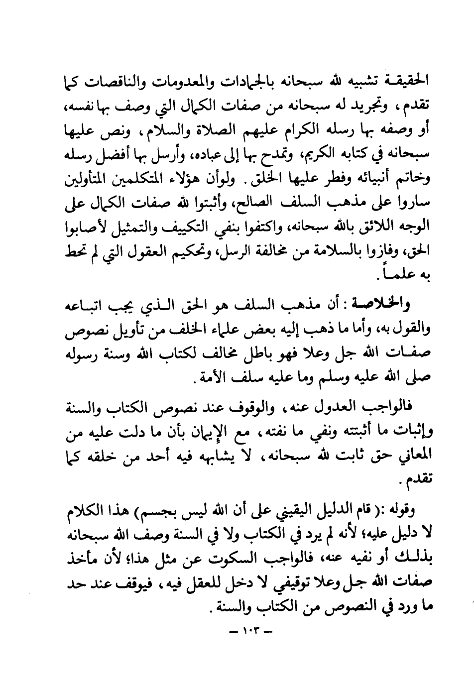 وقوله: (قام الدليل اليقيني على أن الله ليس بجسم) هذا الكلام لا دليل عليه؛ لأنه لم يرد في الكتاب ولا في السنة وصف الله سبحانه بذلك أو نفيه عنه، فالواجب السكوت عن مثل هذا؛ لأن مأخذ صفات الله جل وعلا توقيفي لا دخل للعقل فيه، فيوقف عند حد ما ورد في النصوص من الكتاب والسنة